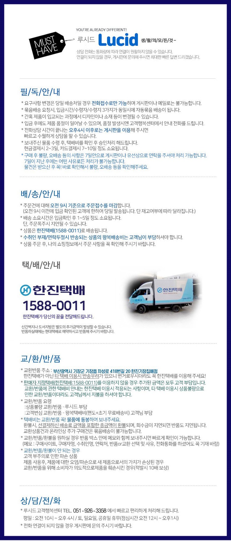 - ㆍ교환/반품에 관한 일반적인 사항은 판매자가 제시사항보다 관계법령이 우선합니다.