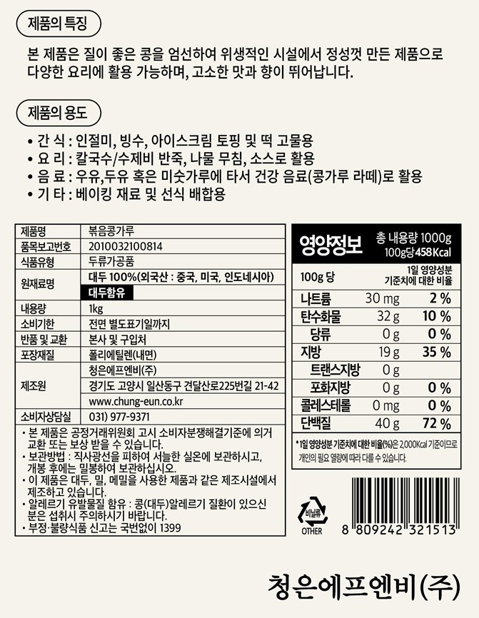| 포장단위별 내용물의 용량(중량), 수량 | 1kg, 1개 | 원재료명 및 함량 | 컨텐츠 참조 |