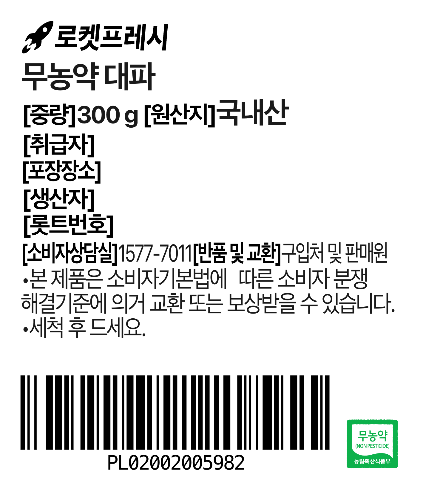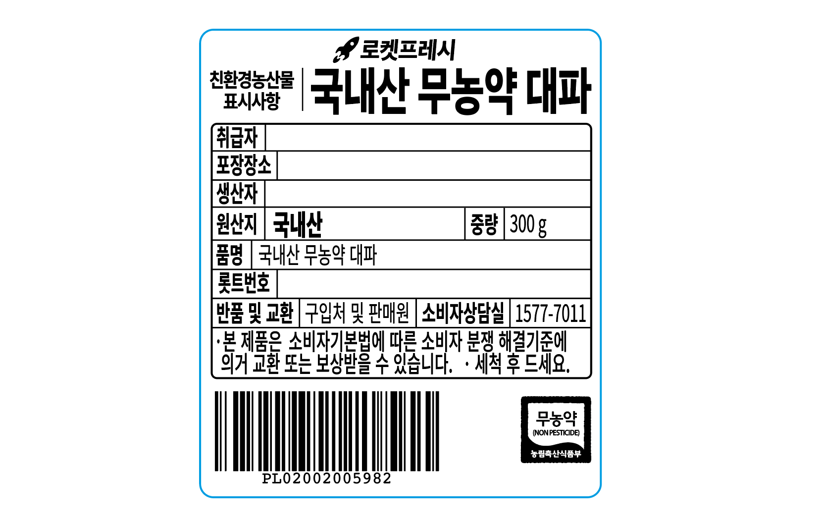 | 품목 또는 명칭 | 국내산 무농약 대파 | 포장단위별 내용물의 용량(중량),수량,크기 | 300gx3개 |