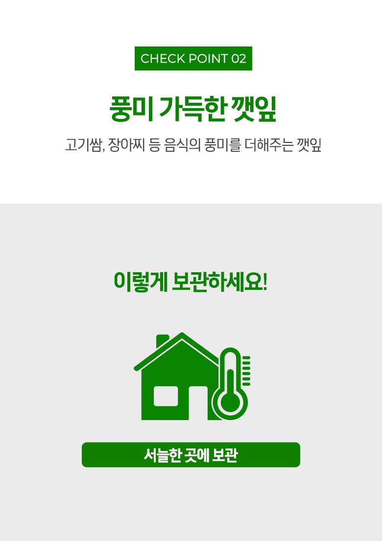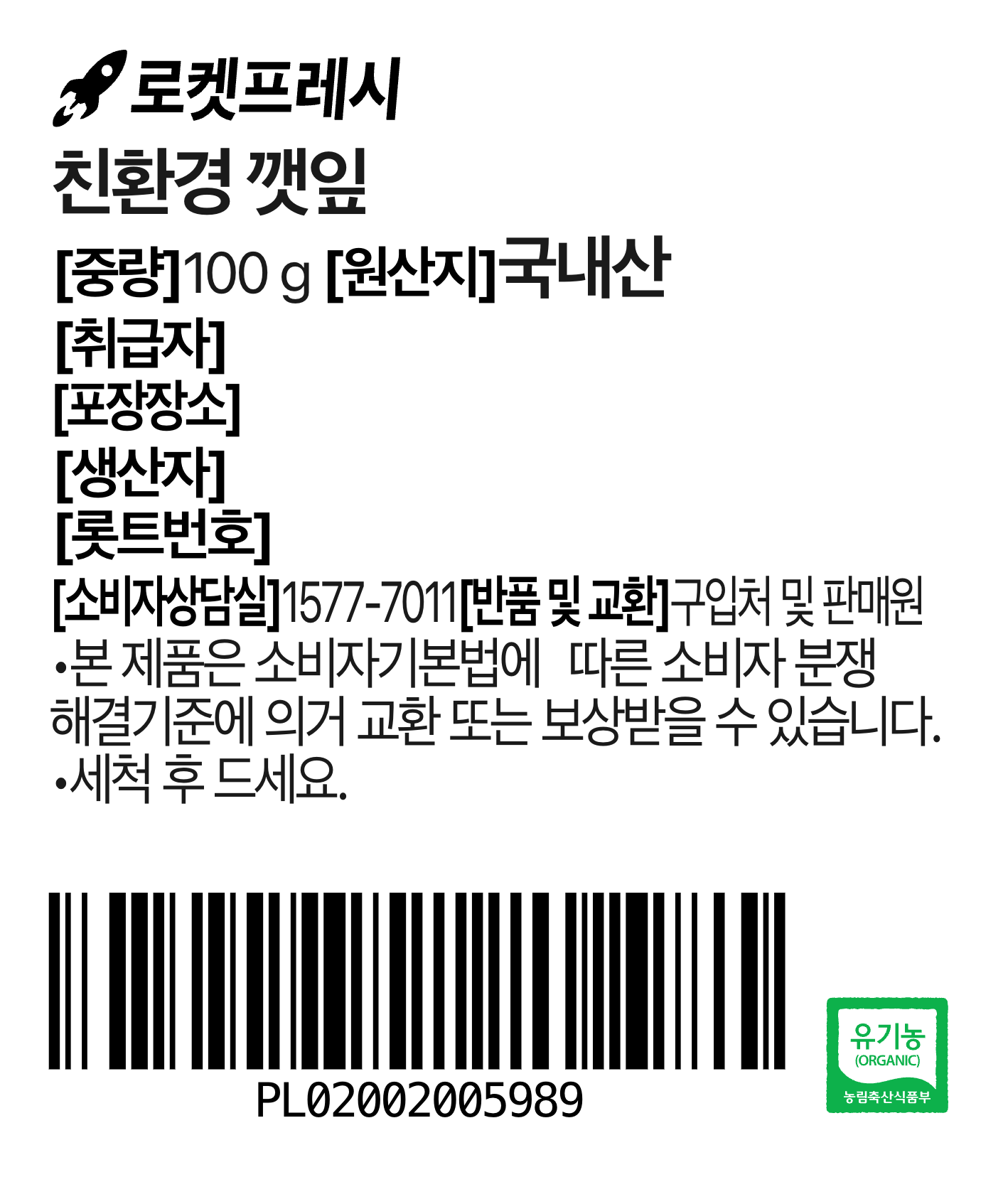 | 품목 또는 명칭 | 국내산 친환경 깻잎 | 포장단위별 내용물의 용량(중량),수량,크기 | 100g |