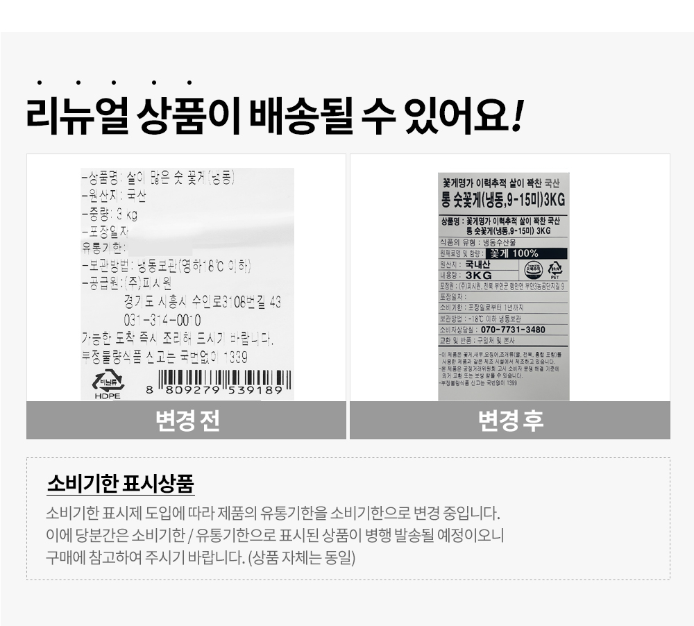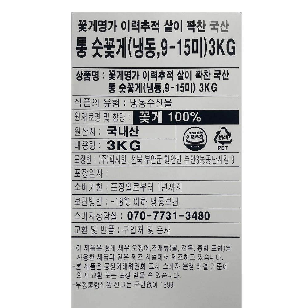 | 품목 또는 명칭 | 살이 많은 숫 꽃게(냉동) | 포장단위별 내용물의 용량(중량),수량,크기 | 3kg, 1박스 |