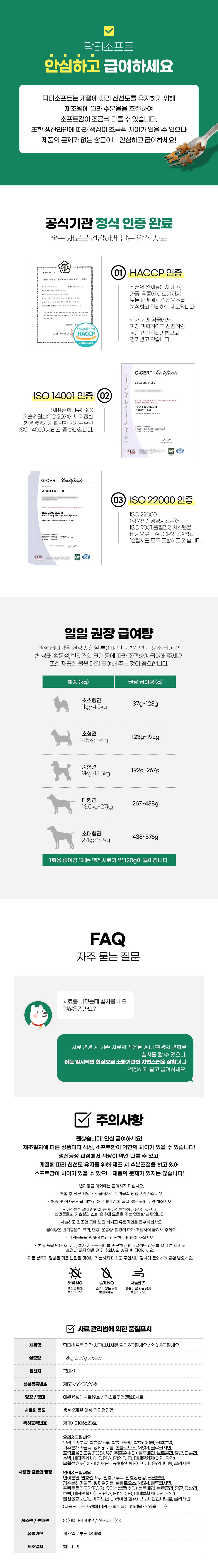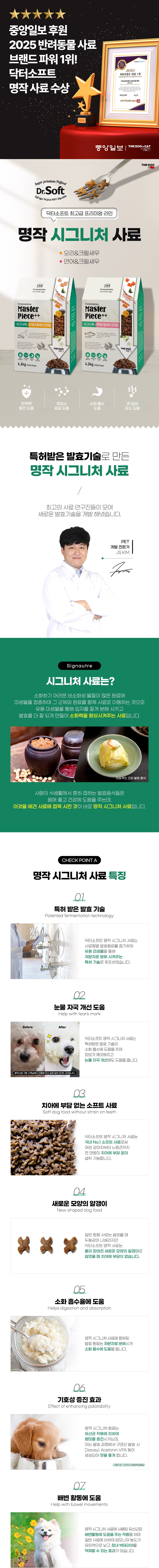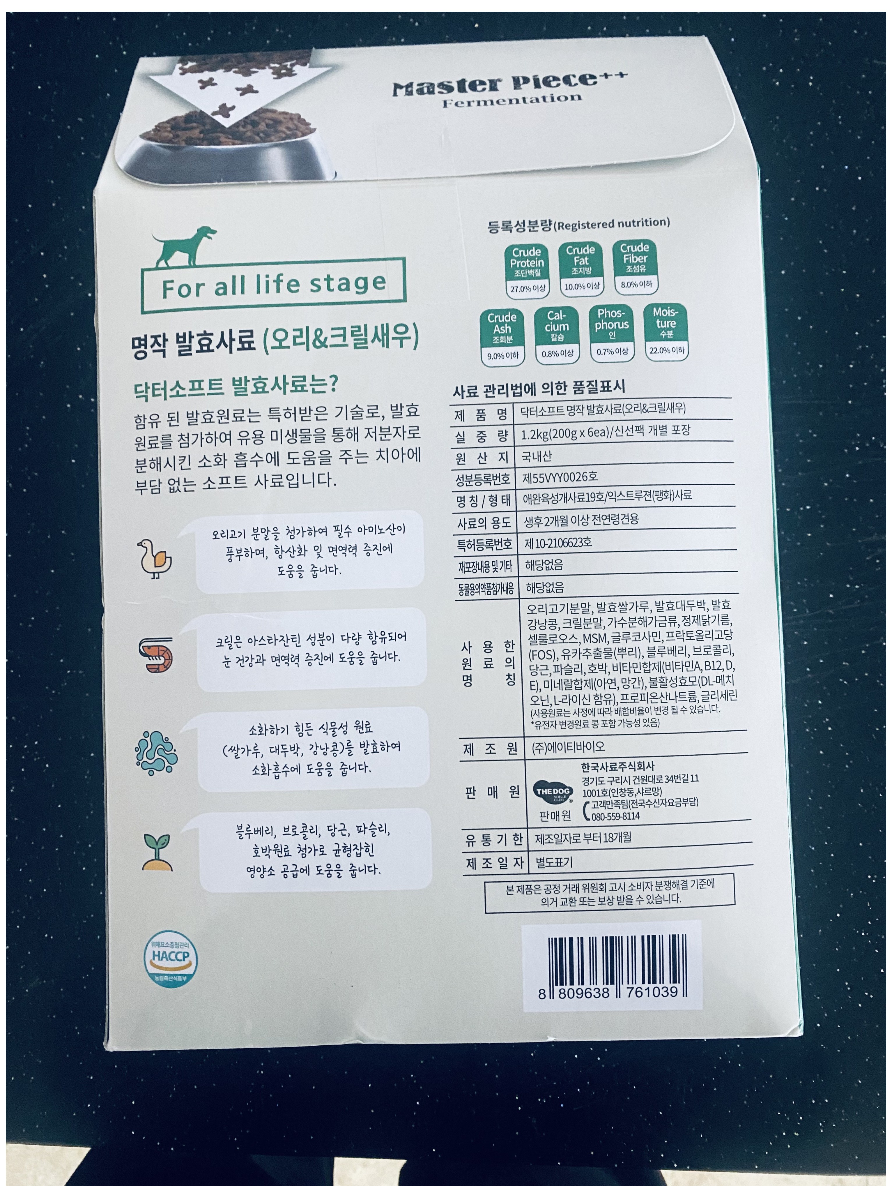 | 품명 및 모델명 | 닥터소프트 명작 발효사료(연어&크릴새우) | 인증/허가 사항 | 사료관리법에 따른 성분등록번호 : 컨텐츠 참조 |