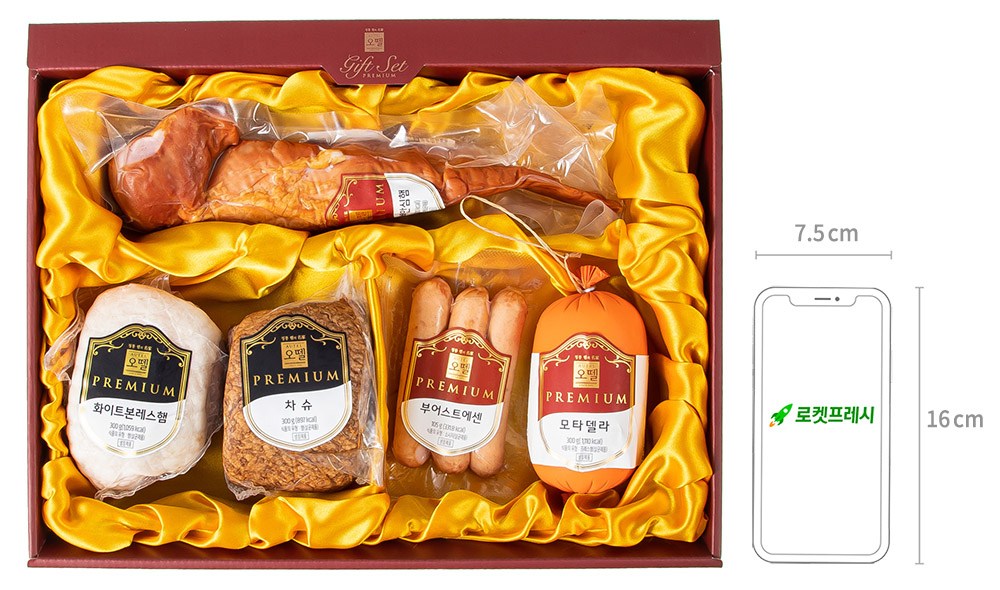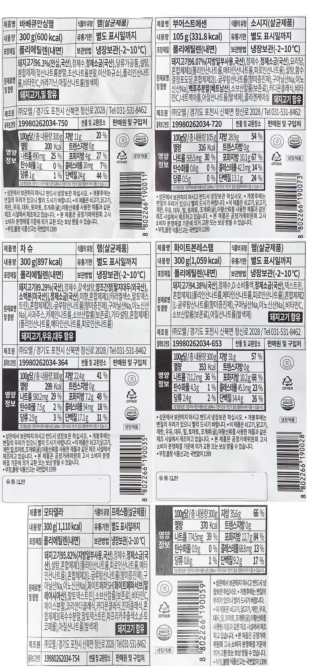| 포장단위별 내용물의 용량(중량), 수량 | 1305g(바베큐안심햄 300g + 화이트본레스햄 300g + 차슈300g + 모타델라 300g + 부어스트에센 105g), 1개 | 원재료명 및 함량 | 컨텐츠참조 |