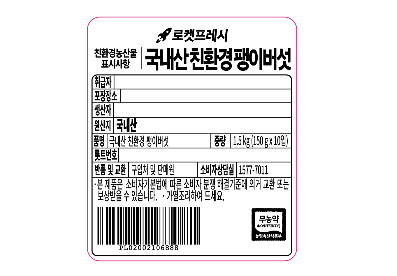| 품목 또는 명칭 | 친환경 팽이버섯 | 포장단위별 내용물의 용량(중량),수량,크기 | 1.5kg(150gx10개) x 6개 |
