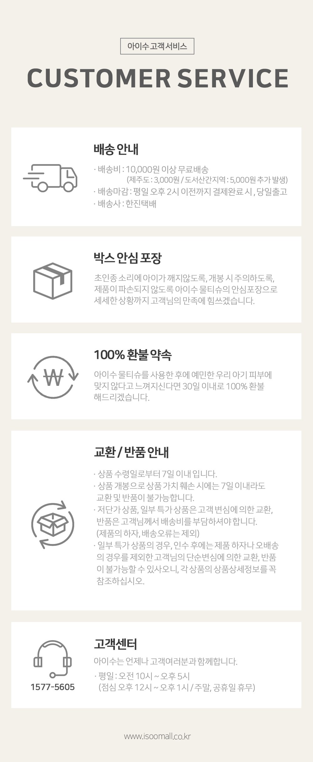 - ㆍ모니터 해상도의 차이로 인해 색상이나 이미지가 실제와 달라, 고객이 단순 변심으로 교환/반품을 무료로 요청하는 경우
