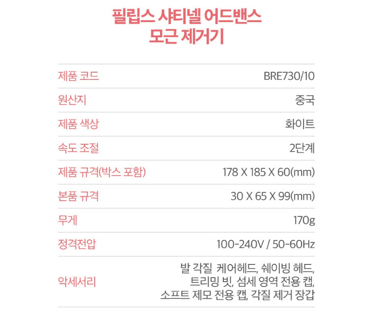 | 품명 및 모델명 | 필립스 모근제거기 샤티넬 어드밴스드 / BRE730/10 | KC 인증정보 | 본품 : R-R-PCE-BRE730 / 충전기: SU07254-14002, R-R-PIG-HQ8505-AD21167 / 내장전지: ZU10632-20001 |