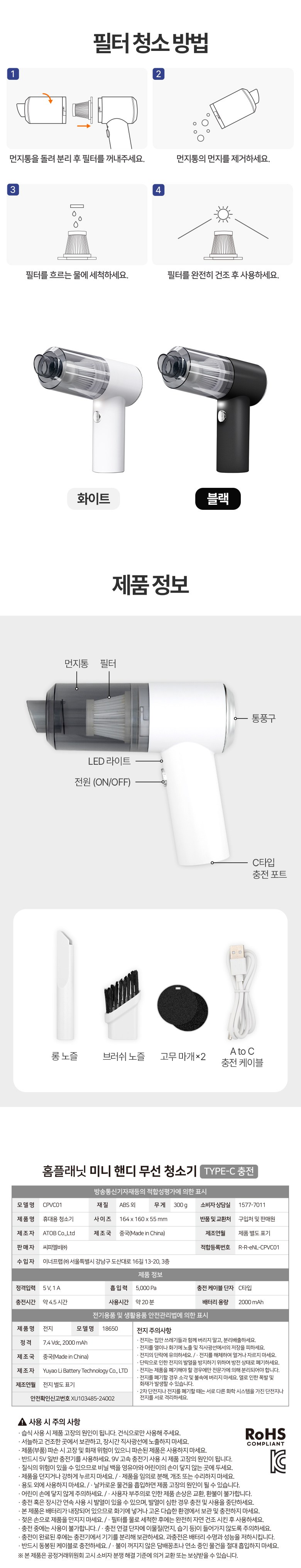 | 품명 및 모델명 | 홈플래닛 휴대용 미니 핸디 무선청소기 가정/차량용 (Type-C 충전) / CPVC01 | KC 인증정보 | 본품: R-R-eNL-CPVC01 / 전지: XU103485-24002 |