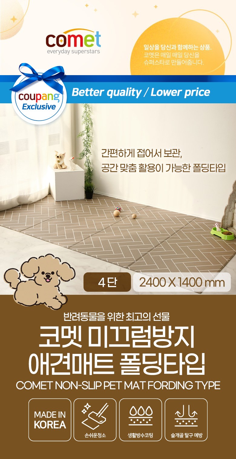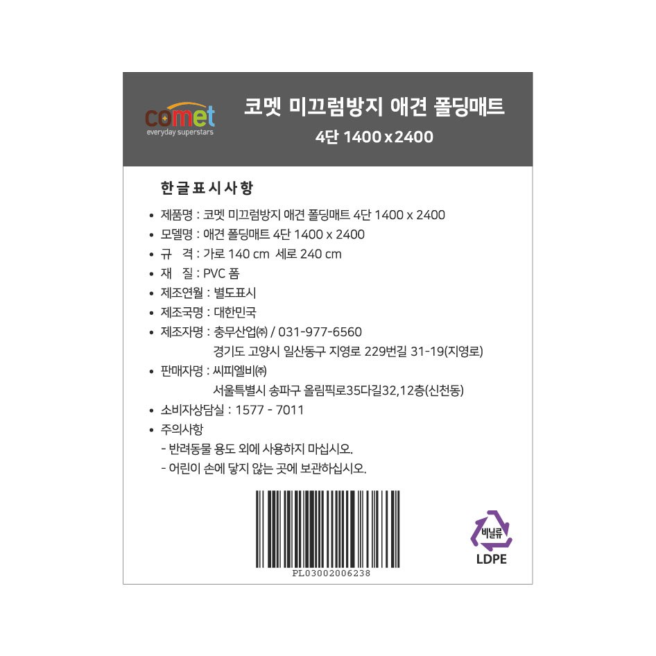 | 품명 및 모델명 | 코멧 미끄럼방지 애견 폴딩매트 4단 2400*1400 | 인증/허가 사항 | 해당없음 |