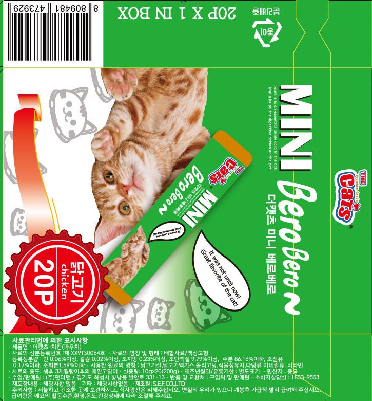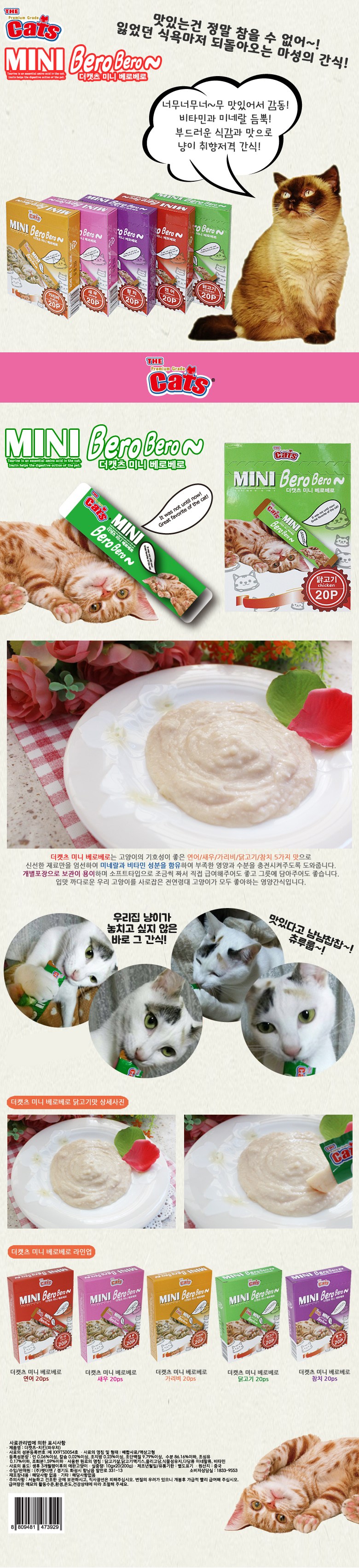 | 품명 및 모델명 | 더 캣츠-치킨(파우치) | 인증/허가 사항 | 사료관리법에 따른 성분등록번호 : 컨텐츠 참조 |