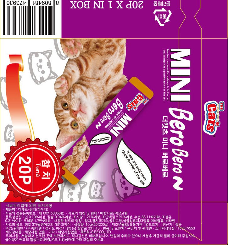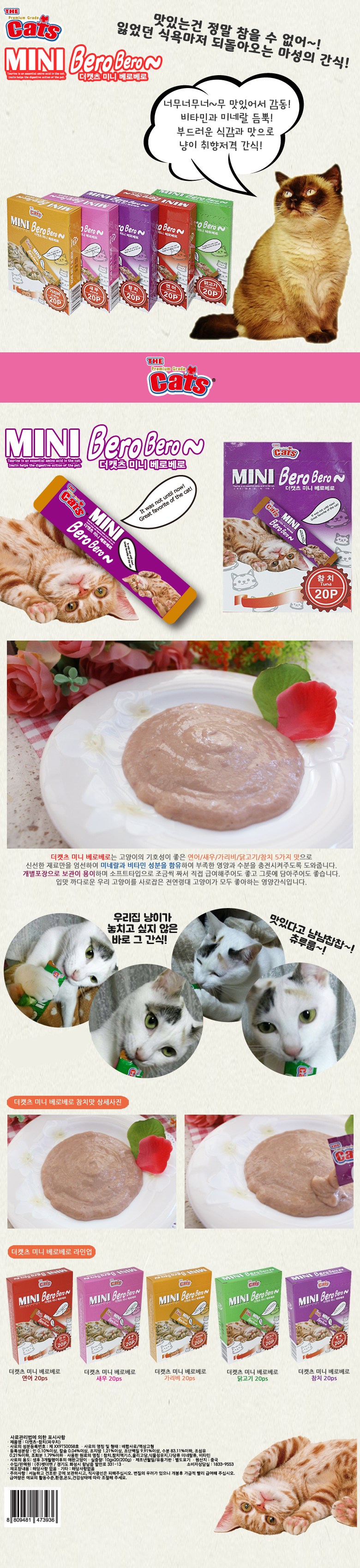 | 품명 및 모델명 | 더캣츠-참치(파우치) | 인증/허가 사항 | 사료관리법에 따른 성분등록번호 : 컨텐츠 참조 |