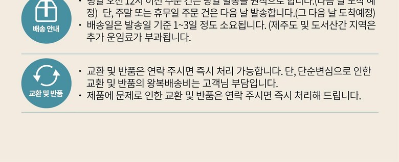 - ㆍ모니터 해상도의 차이로 인해 색상이나 이미지가 실제와 달라, 고객이 단순 변심으로 교환/반품을 무료로 요청하는 경우