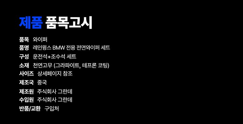 | 품명 및 모델명 | 레인윙스 BMW 전용 전면와이퍼 세트 | 동일모델 출시년월 | 업체미제공 |