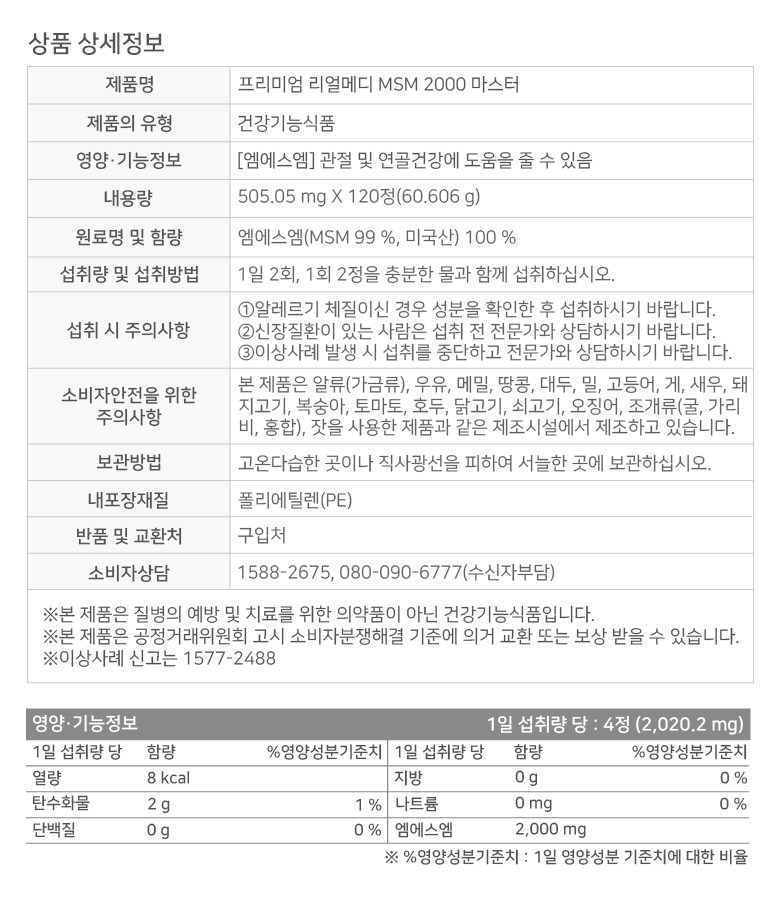 | 소비기한 및 보관방법 | 보관방법: 컨텐츠 참조 | 포장단위별 내용물의 용량(중량), 수량 | 120정 x 4개 |