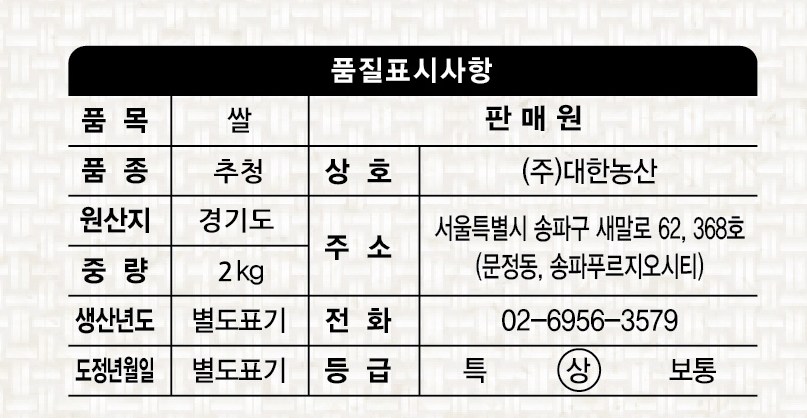 | 제조연월일, 소비기한 또는 품질유지기한 | 업데이트 예정 | 세부 품목군별 표시사항 | 농수산물 : 유전자변형(해당 없음) / 지리적 표시사항(해당 없음) |