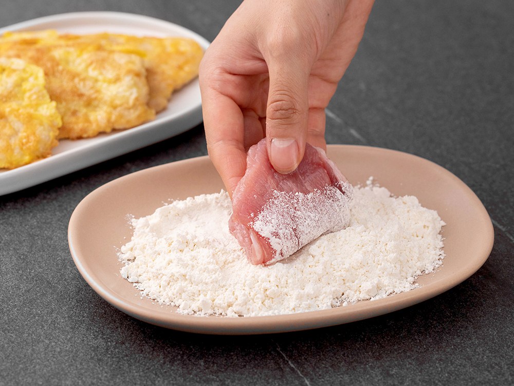 2. 달걀을 풀어 돼지고기에 달걀물, 부침가루 순서로 반죽 옷을 입혀주세요.