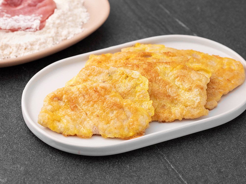 재료: 육전용 돼지고기 400g, 부침가루 200g, 달걀 2개, 소금 약간, 후추 약간