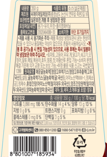 | 제품명 | 프리미엄 매운굴소스 | 식품의 유형 | 컨텐츠 참조 |