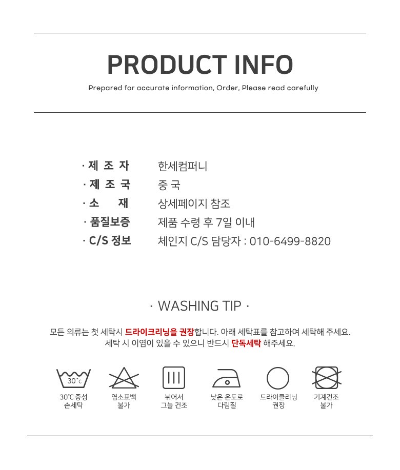 | 제조국 | 상품 상세페이지 참조 | 세탁방법 및 취급시 주의사항 | 상품 상세페이지 참조 |