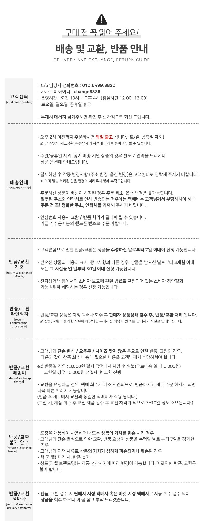 - ㆍ교환/반품에 관한 일반적인 사항은 판매자가 제시사항보다 관계법령이 우선합니다.