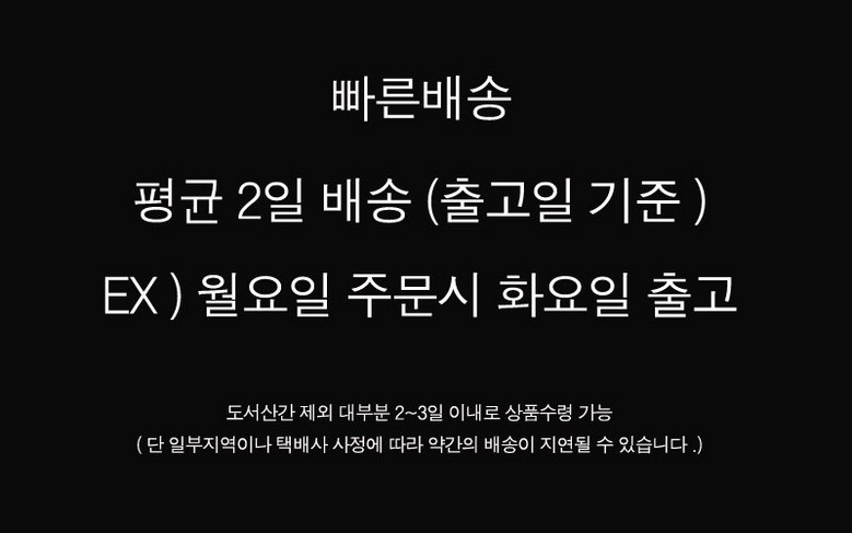 | 배송기간 | ㆍ도서산간 지역 등은 배송에 3-5일이 더 소요될 수 있습니다. - 천재지변, 물량 수급 변동 등 예외적인 사유 발생 시, 다소 지연될 수 있는 점 양해 부탁드립니다. | ||