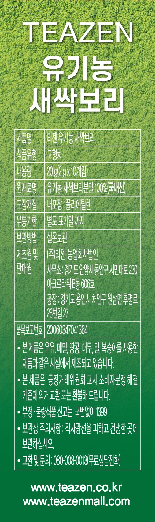 | 제품명 | 티젠 유기농 새싹보리 | 식품의 유형 | 고형차 |