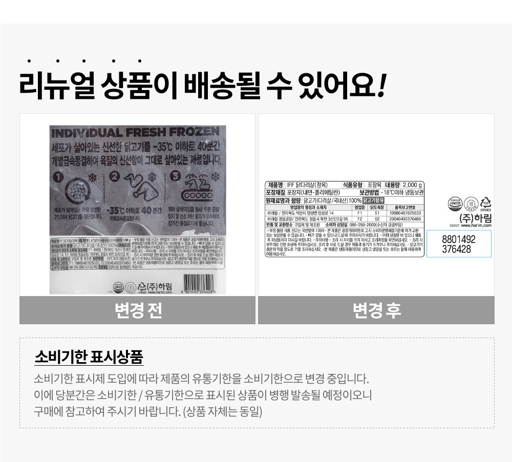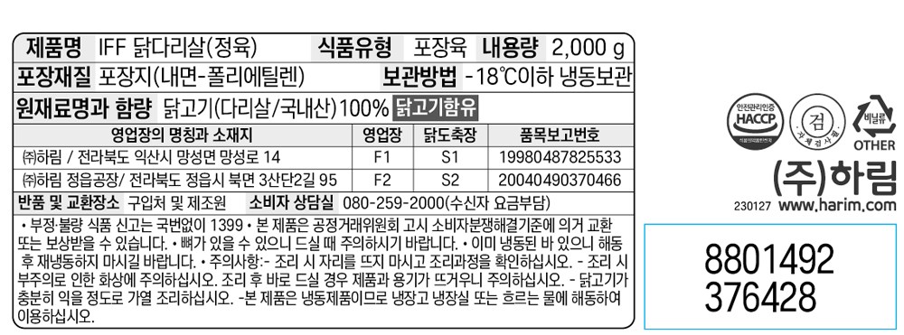 | 품목 또는 명칭 | IFF 닭다리살(정육) | 포장단위별 내용물의 용량(중량),수량,크기 | 2kg, 1개 |