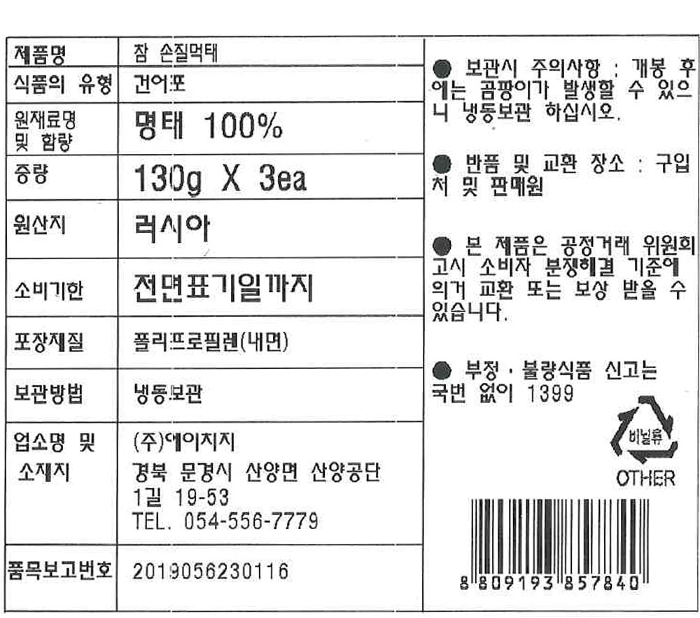 | 제품명 | 참 손질먹태 | 식품의 유형 | 건어포 |