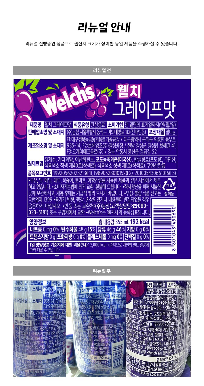 | 제품명 | 웰치스 그레이프맛 | 식품의 유형 | 컨텐츠 참조 |