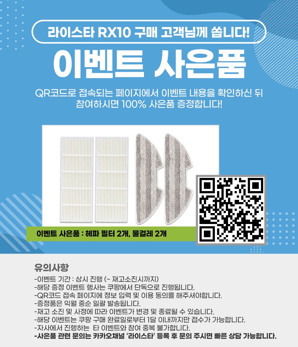 | 품명 및 모델명 | 라이스타 로봇청소기 RX10 매트 블랙 | KC 인증정보 | 본품 : R-C-LfR-RX10 / 어댑터 : SU10616-18001 / 배터리 : XU101157-20014A |