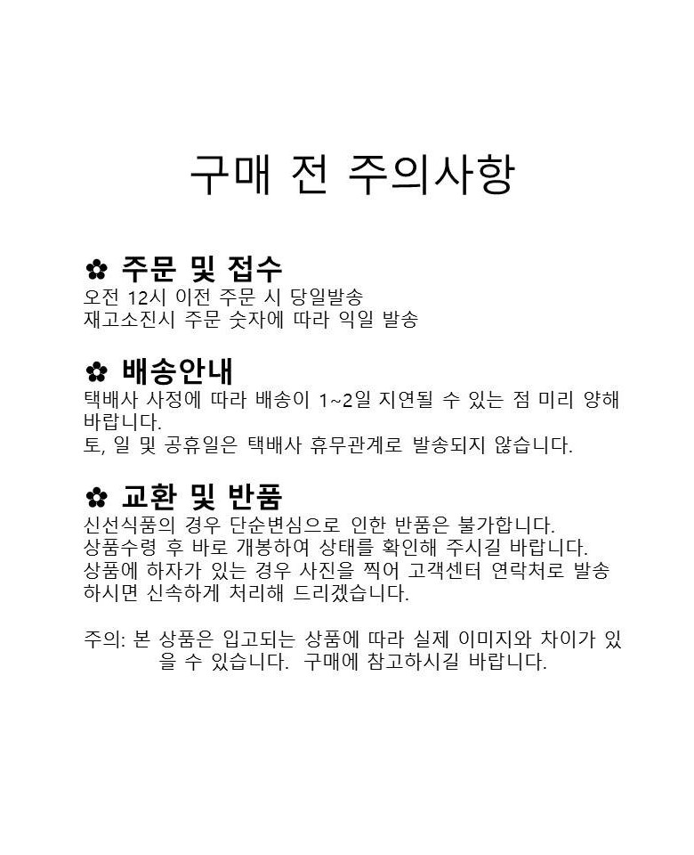 | 배송방법 | 순차배송 | 배송비 | 3,000원 - 도서산간 지역 배송불가 |