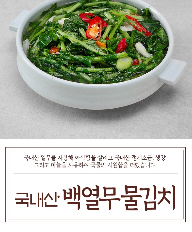 | 제품명 | 국내산 백열무 물김치 | 식품의 유형 | 컨텐츠 참조 |