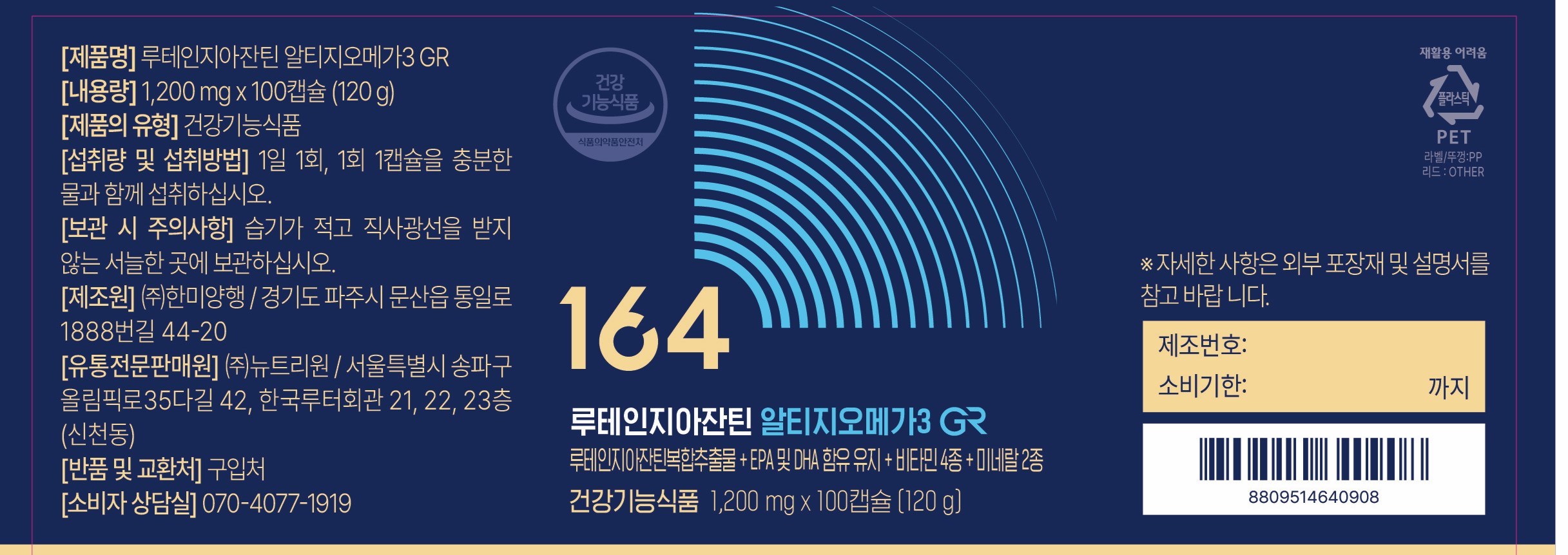| 소비기한 및 보관방법 | 소비기한(또는 유통기한) : 2027년 04월 22일 이거나 그 이후인 상품 제조년월일 : 2025년 05월 03일 이후인 제조상품 보관방법: 컨텐츠 참조 | 포장단위별 내용물의 용량(중량), 수량 | 1200mg x 100정 x 2개 |