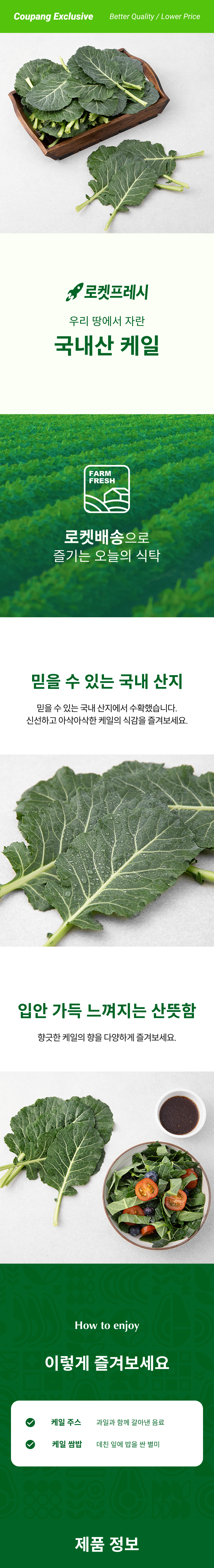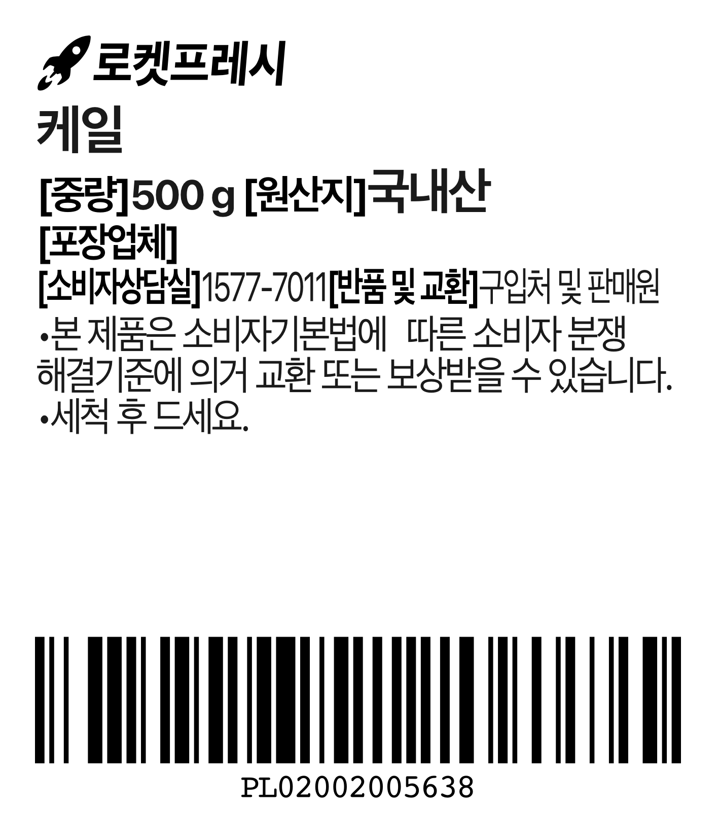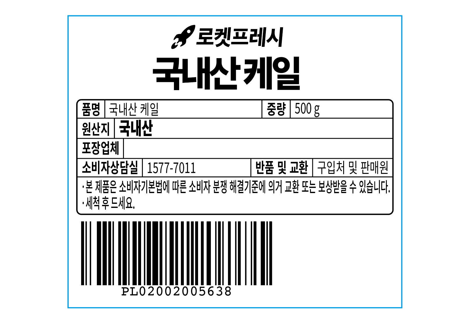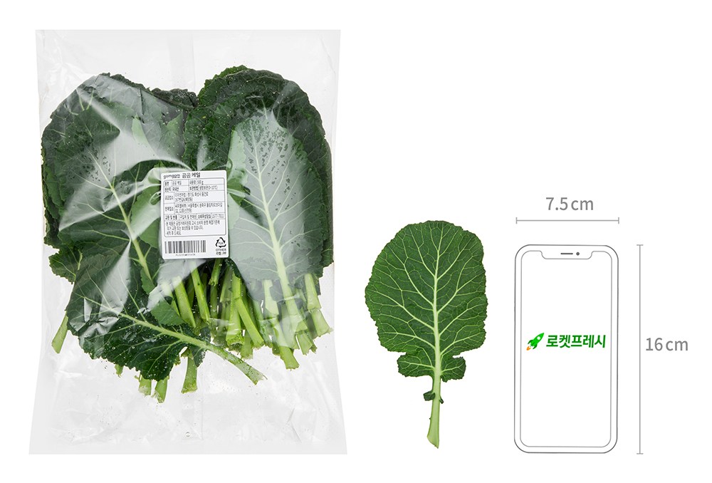 | 품목 또는 명칭 | 국내산 케일 | 포장단위별 내용물의 용량(중량),수량,크기 | 500g x 2개 |