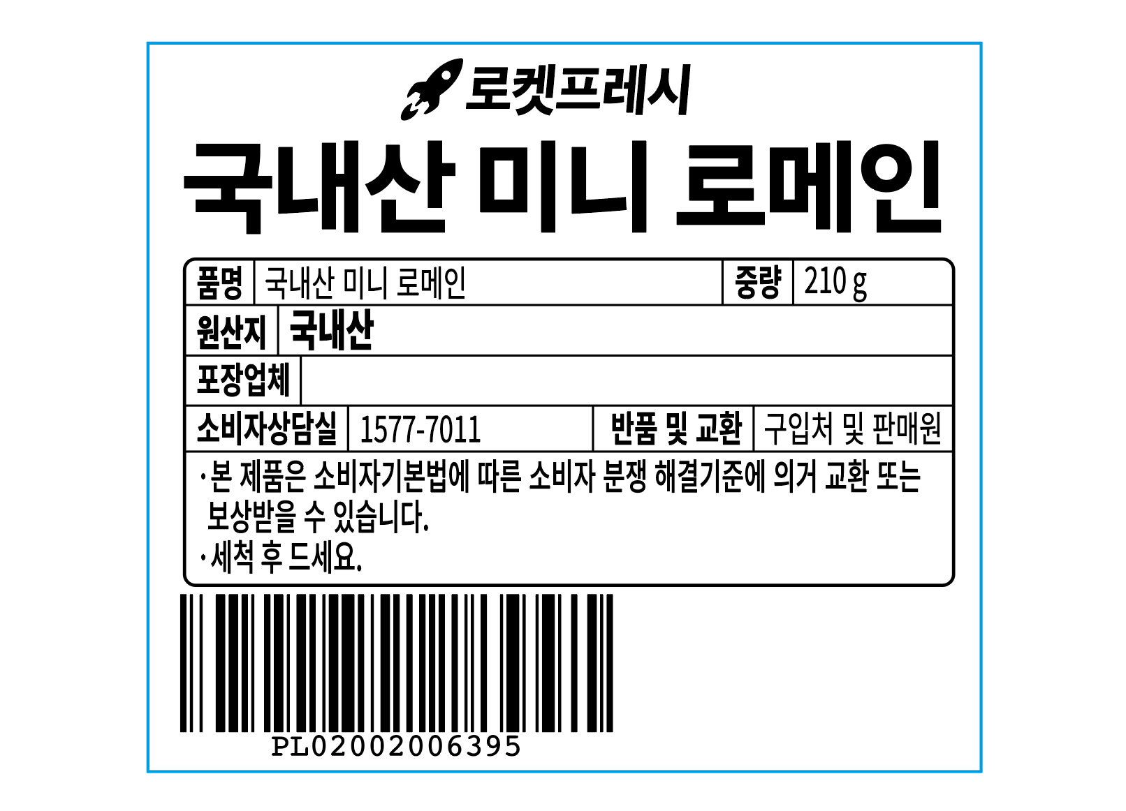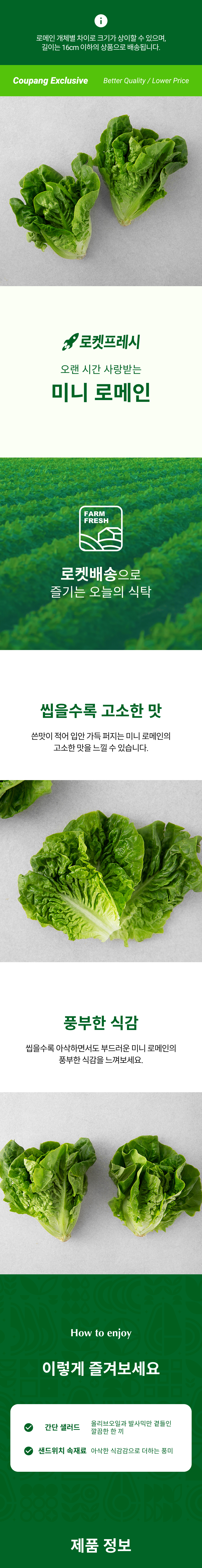 | 품목 또는 명칭 | 미니 로메인 | 포장단위별 내용물의 용량(중량),수량,크기 | 210gx1개 |