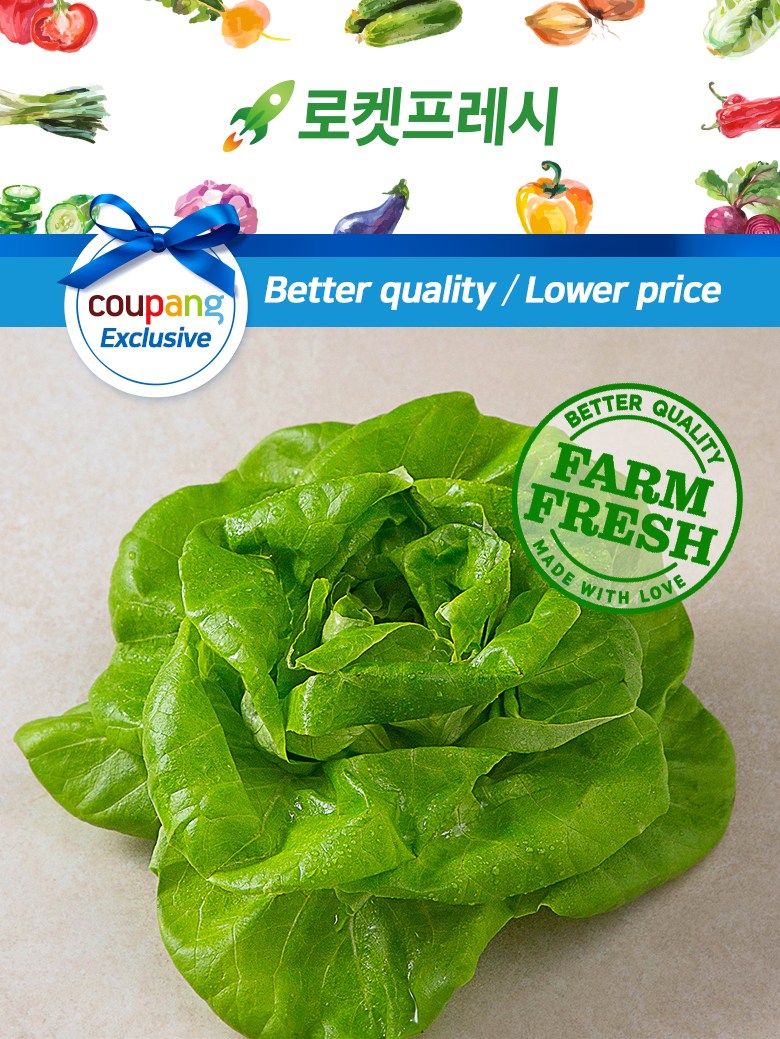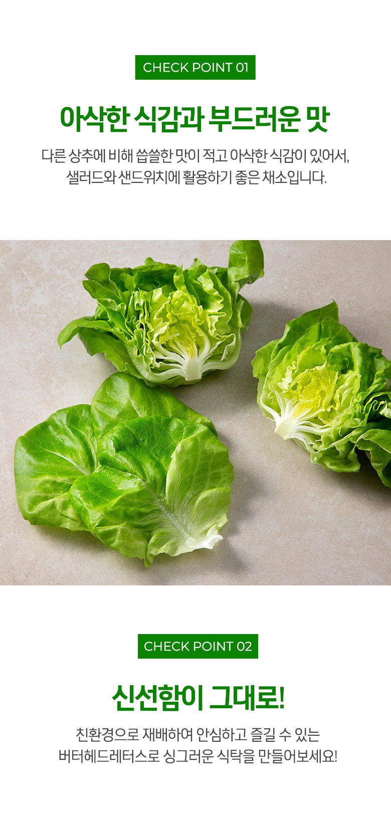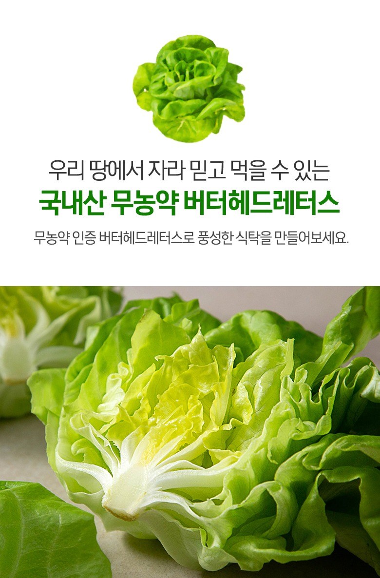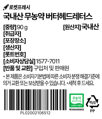 | 품목 또는 명칭 | 국내산 무농약 버터헤드레터스 | 포장단위별 내용물의 용량(중량),수량,크기 | 90gx2개 |