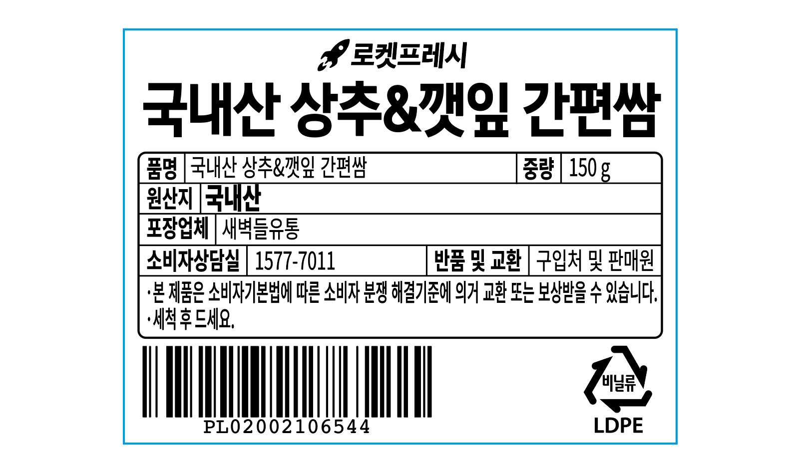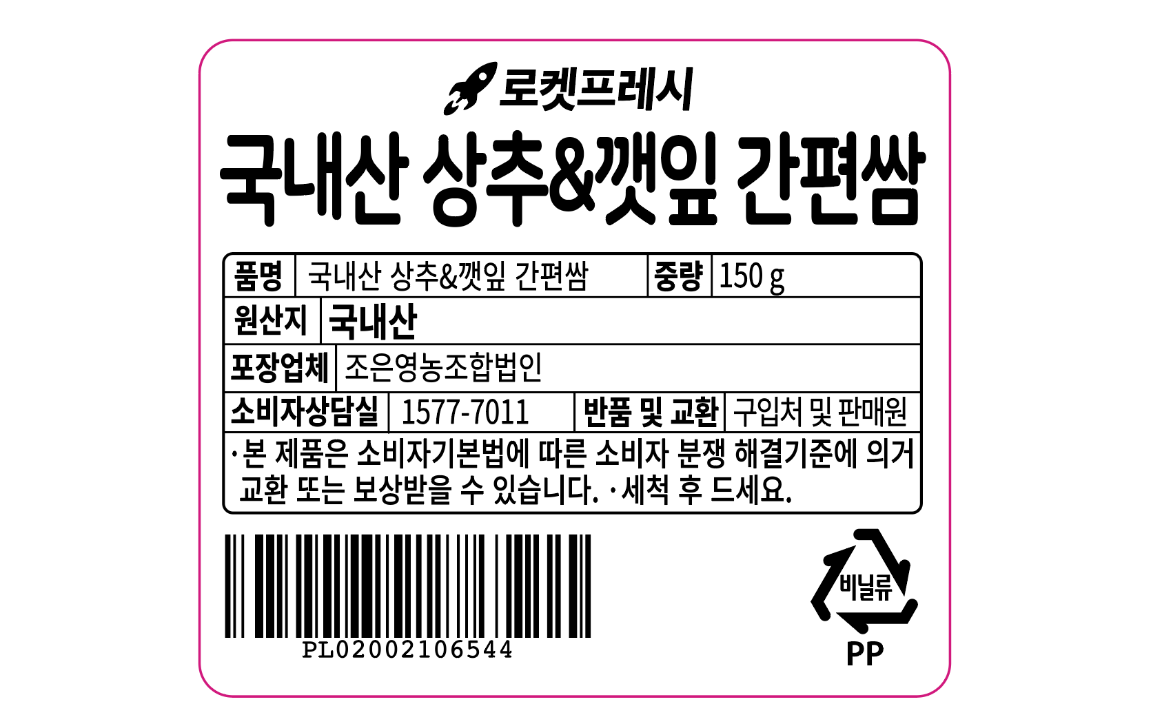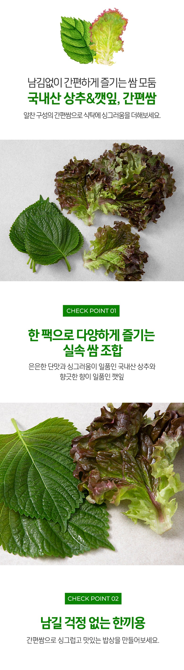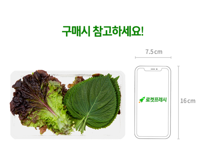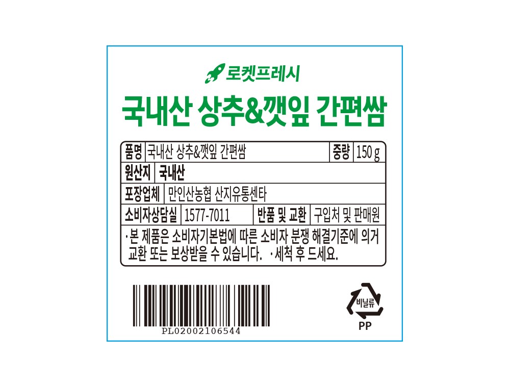 | 품목 또는 명칭 | 국내산 상추&깻잎 간편쌈 | 포장단위별 내용물의 용량(중량),수량,크기 | 150gx3개 |