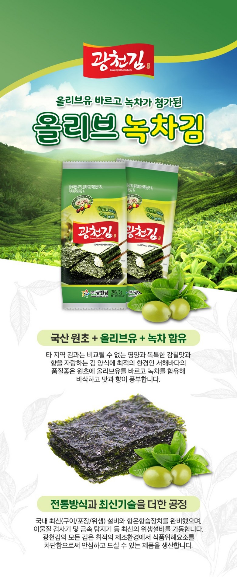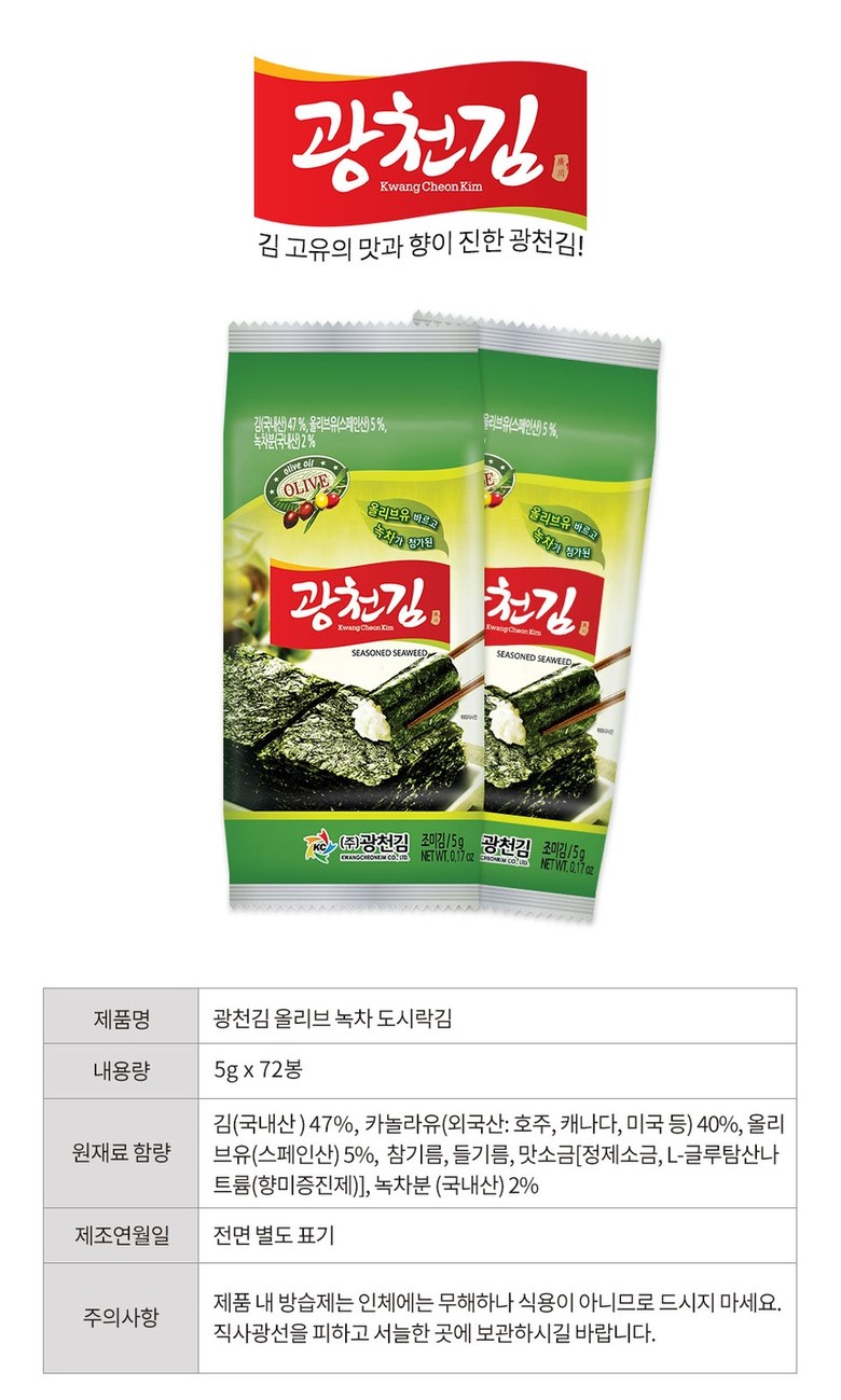 | 품목 또는 명칭 | 광천김 올리브 녹차 도시락김 | 포장단위별 내용물의 용량(중량),수량,크기 | 1봉 5g(9매)x3Px24팩 = 총 72봉(1박스) |