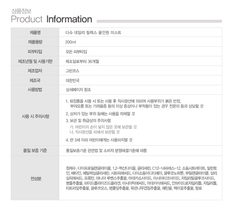 | 화장품제조업자, 화장품책임판매업자 및 맞춤형화장품판매업자 | 그린코스(주)/다슈코리아(주) | 제조국 | 대한민국 |
