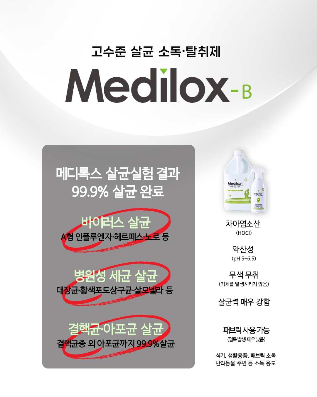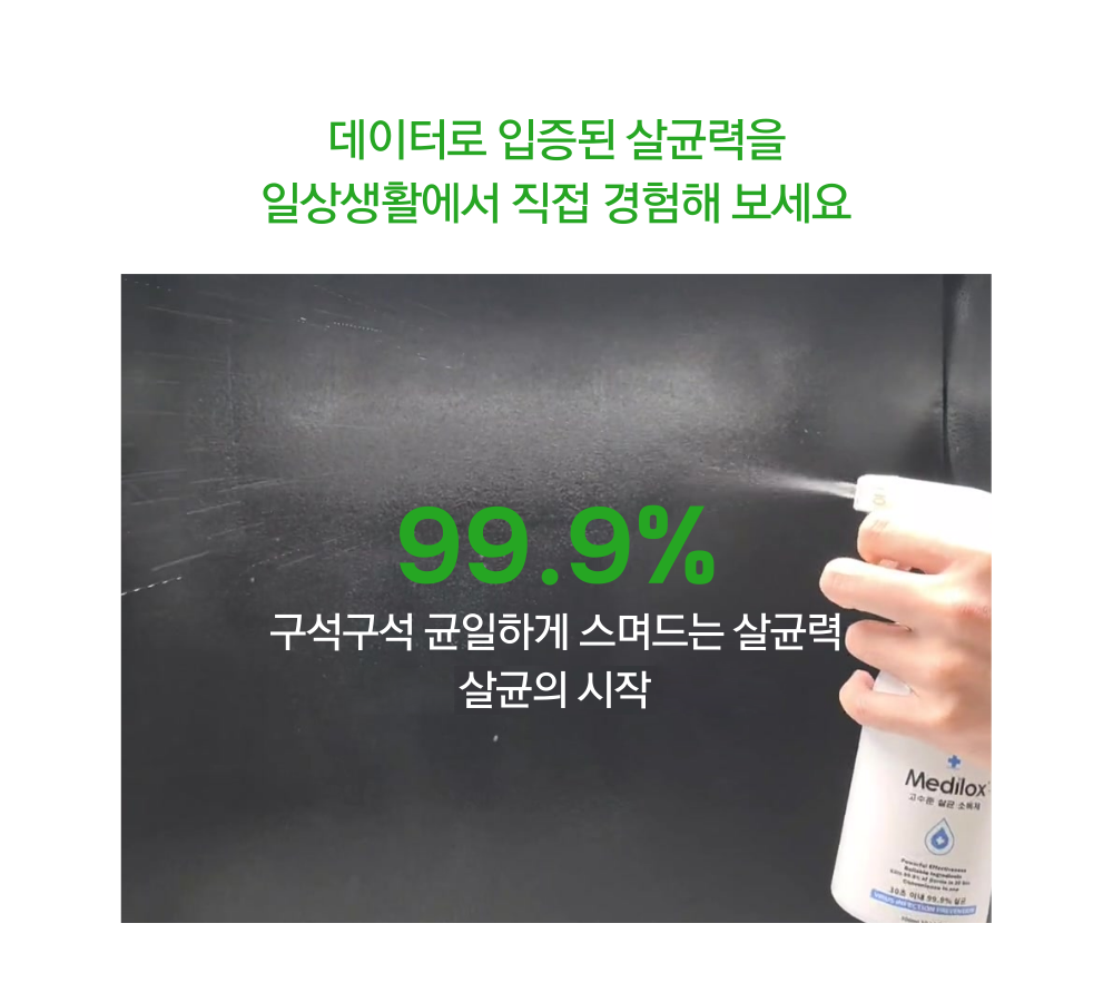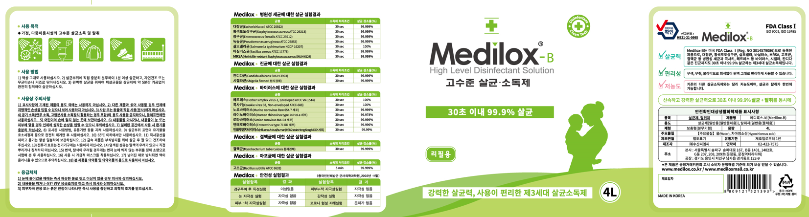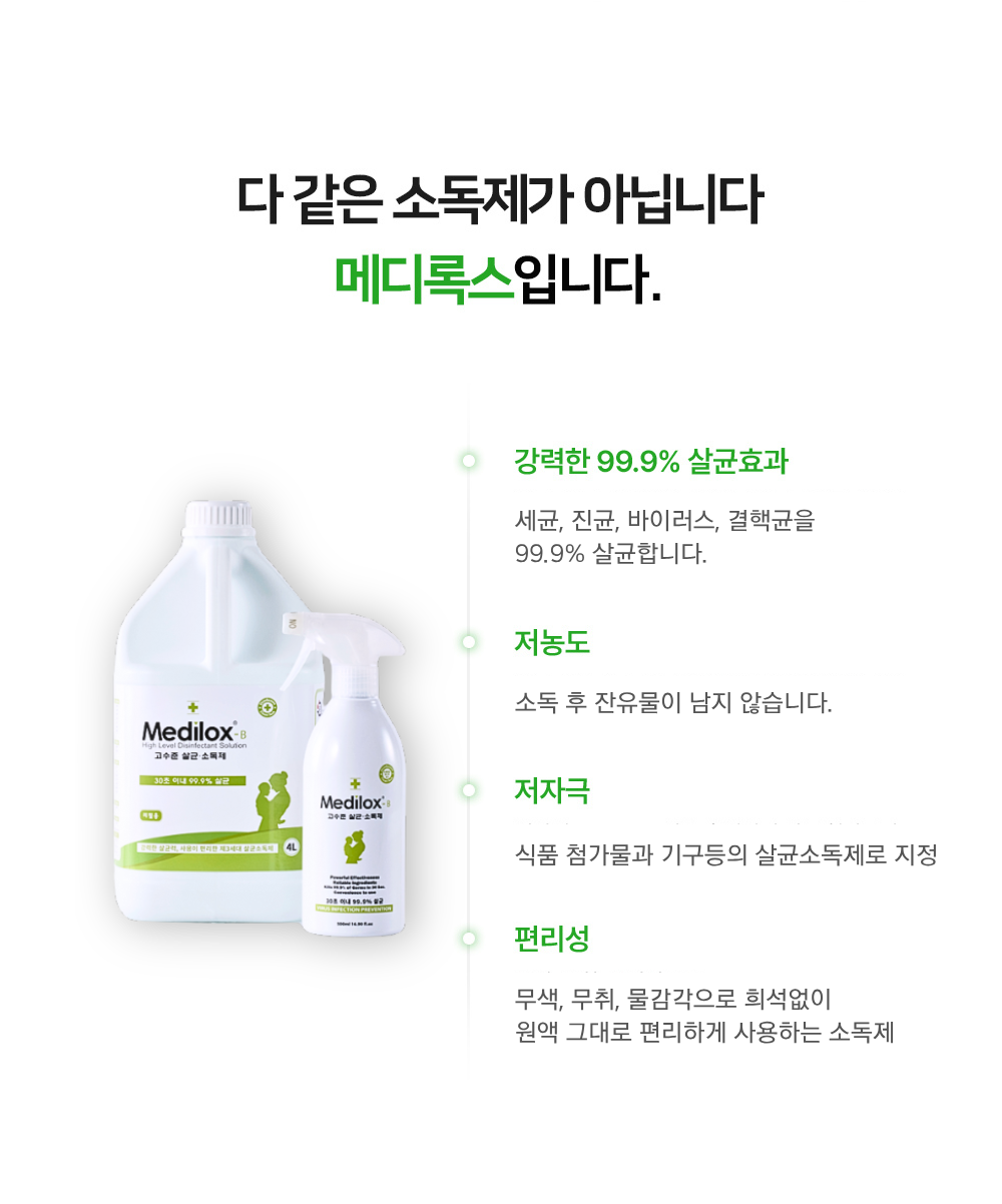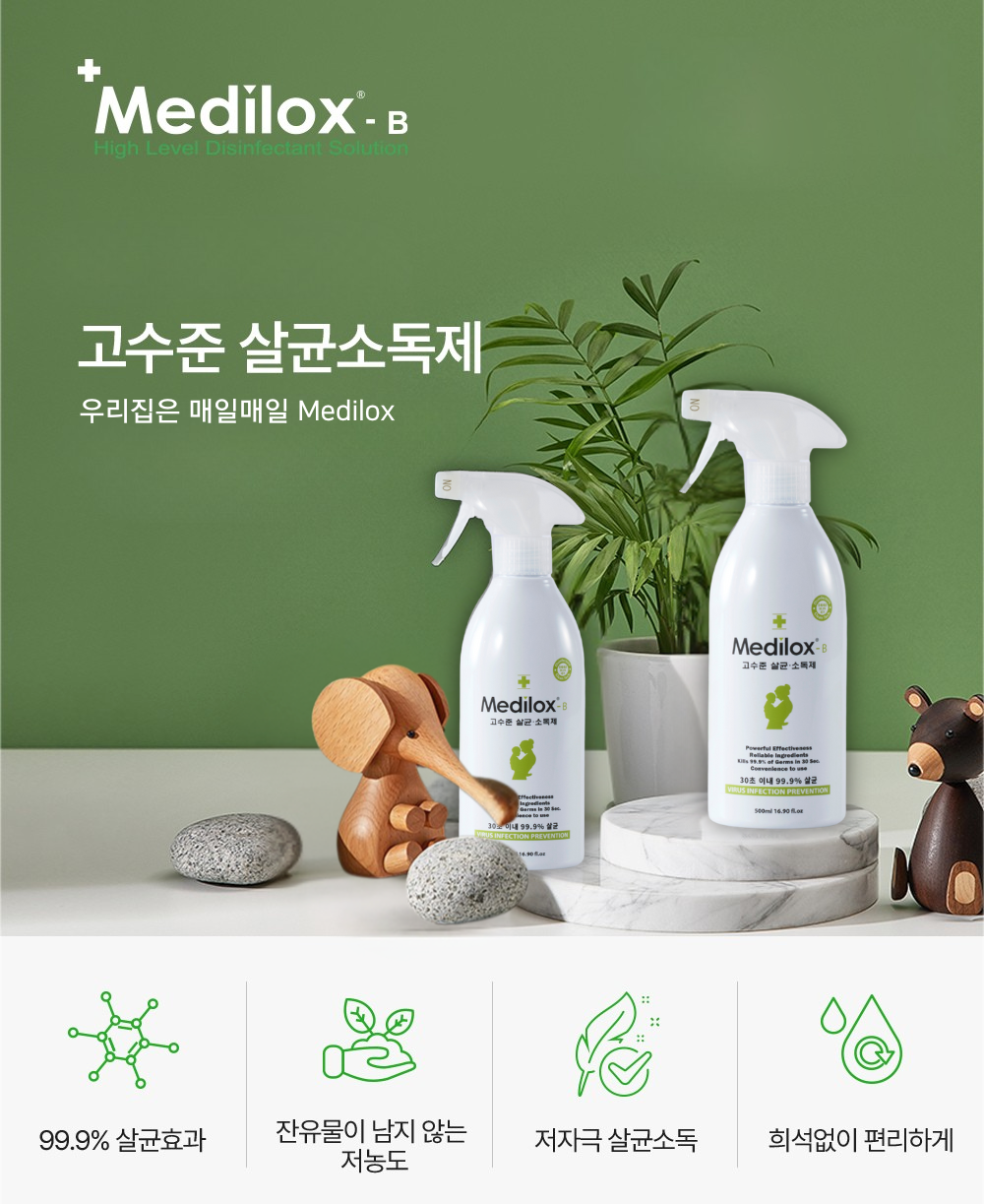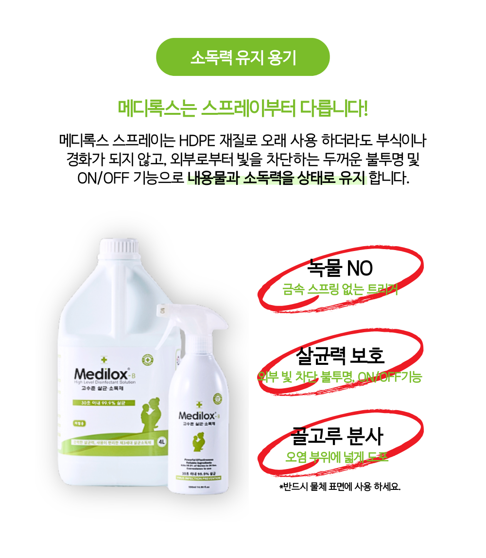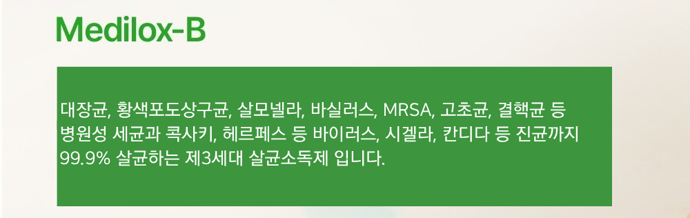 | 품목 및 제품명 | 살균제, 탈취제 / 메디록스-비(Medilox-B) | 용도(표백제의 경우 계열을 함께표시) 및 제형 | 살균제[일반용(일반물체용)], 탈취제[일반용(물체용)] / 보충형(분무기형) |