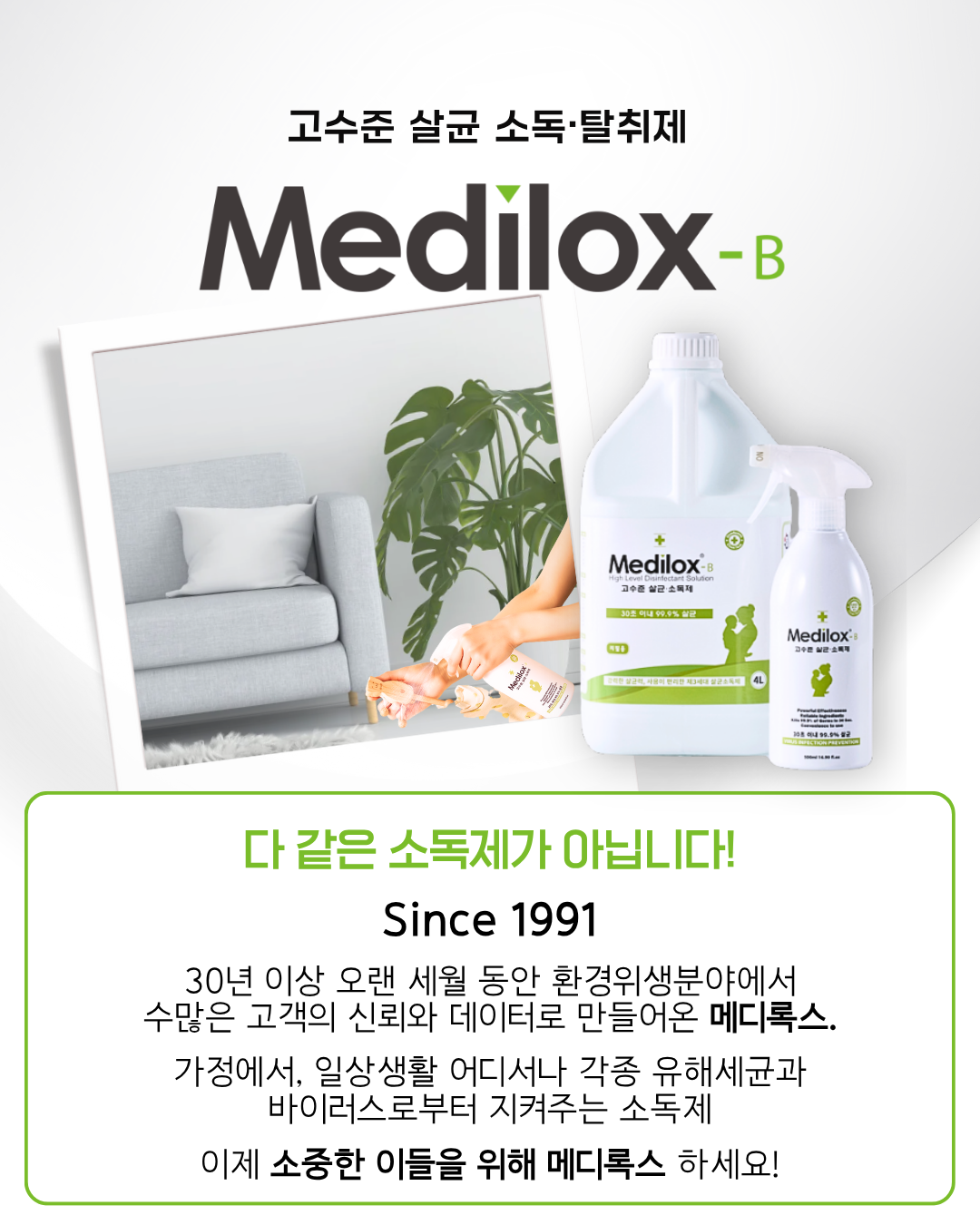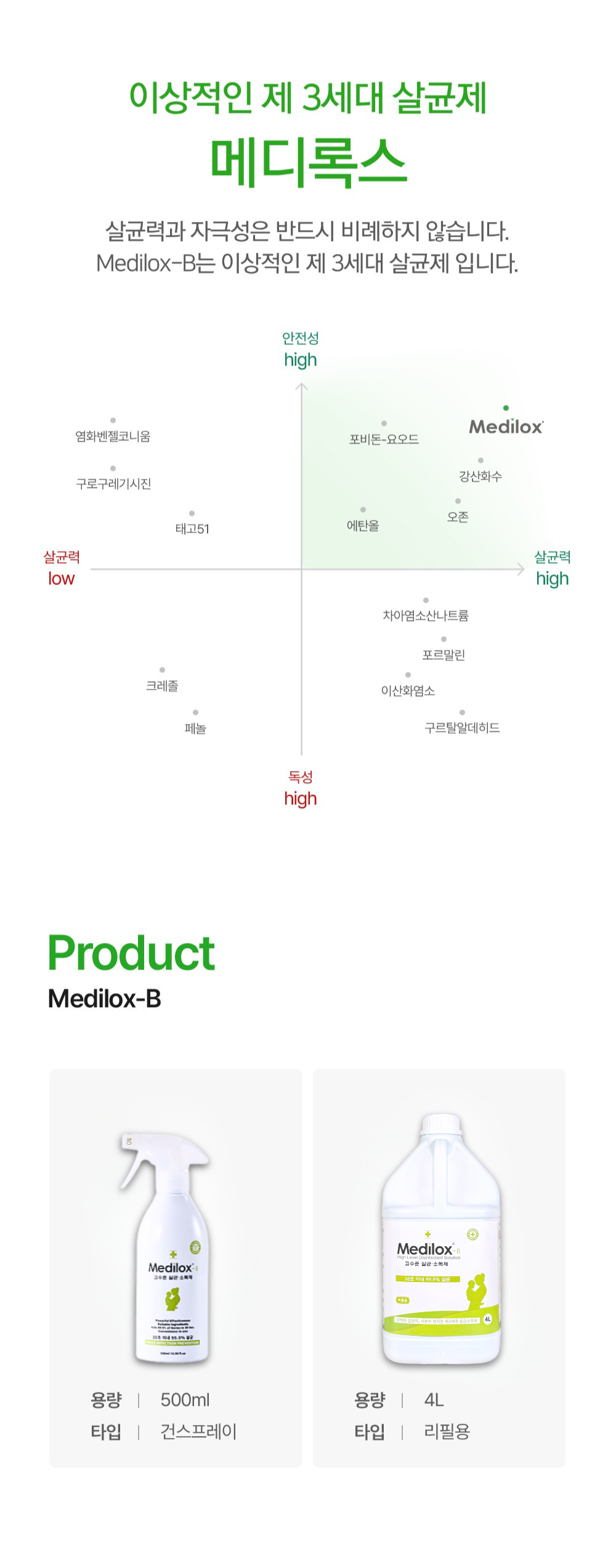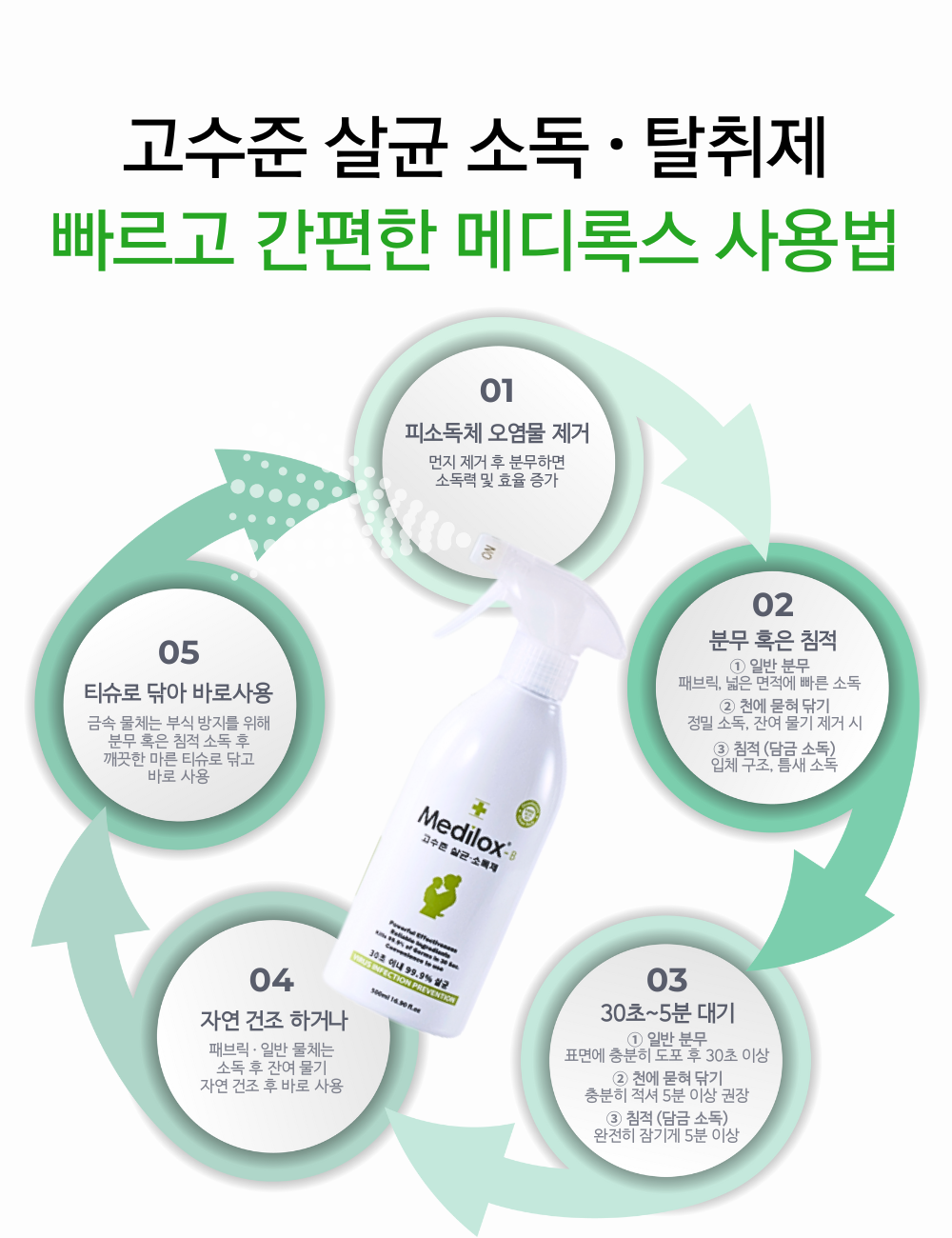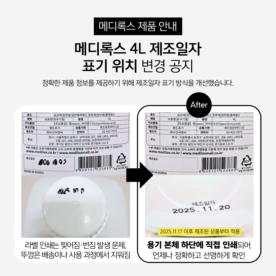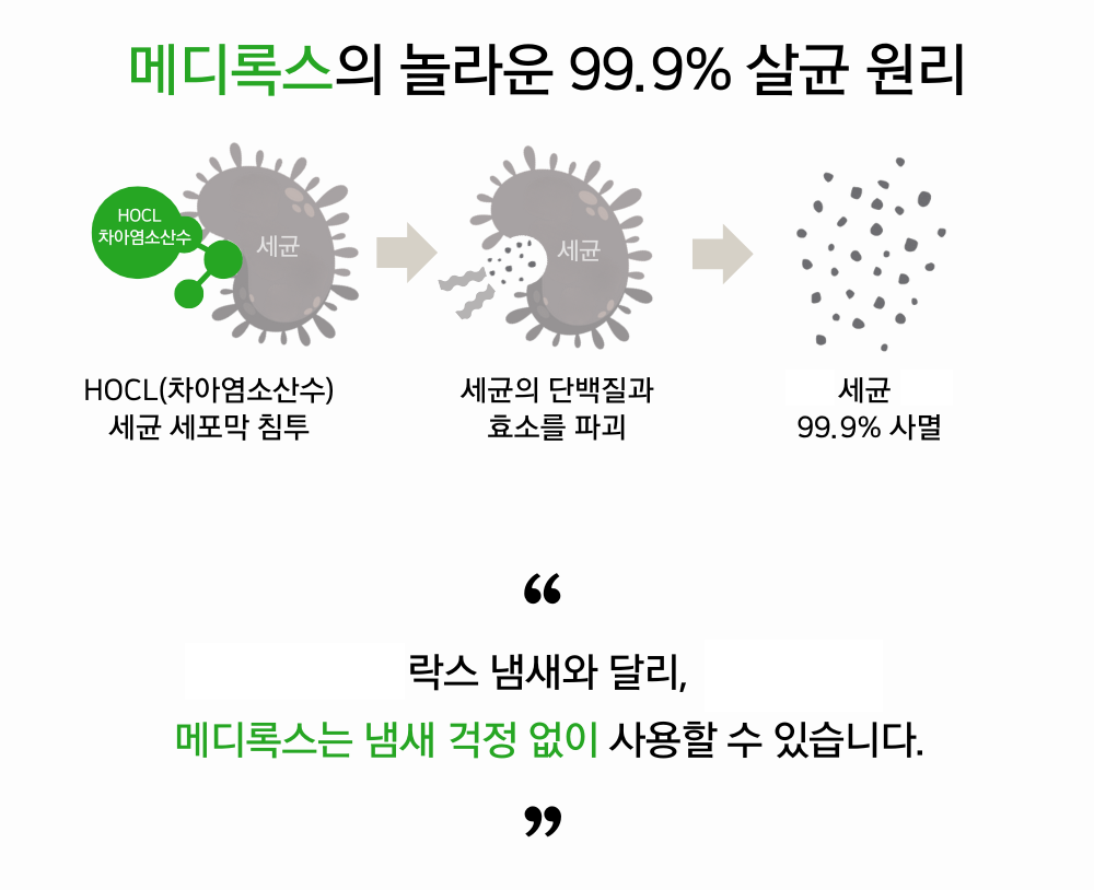 | 품목 및 제품명 | 살균제, 탈취제 / 메디록스-비(Medilox-B) | 용도(표백제의 경우 계열을 함께표시) 및 제형 | 살균제[일반용(일반물체용)], 탈취제[일반용(물체용)] / 보충형(분무기형) |