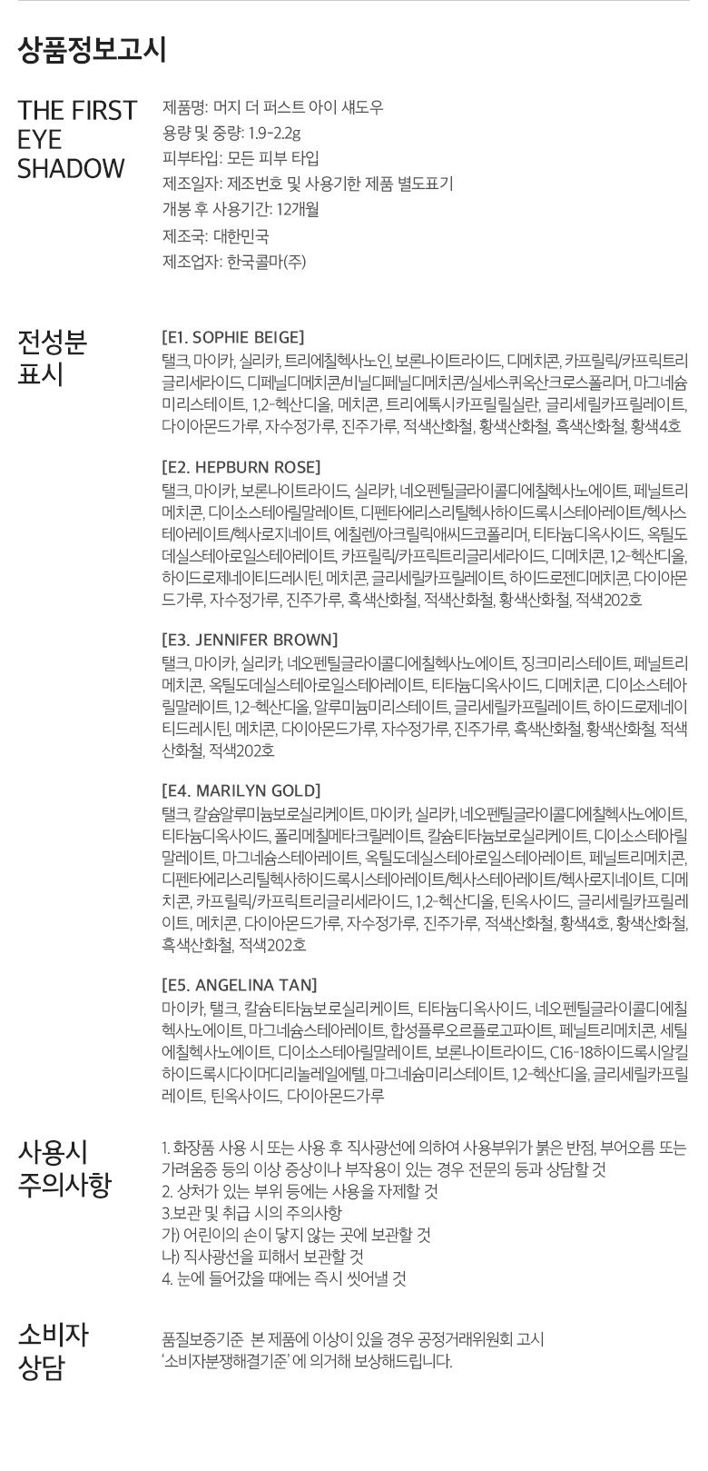 | 사용기한 또는 개봉 후 사용기간 | 제조일부터 3년. 공급사 사정에 따라 제조일자가 다른 상품이 입고되어 정확한 제조년월일 및 사용기한 확인이 어렵습니다. 제조년월일 확인이 어려운 상품은 유통기한을 기준으로 배송되므로 구매 시 유통기한을 참고 부탁드립니다. | 사용방법 | 내용물을 손가락 또는 브러쉬를 사용하여 적당량을 취해 원하는 눈도덩이에 부드럽게 펴 발라줍니다. |
