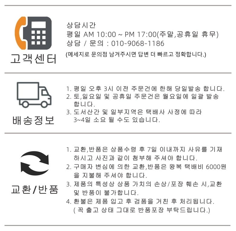- ㆍ모니터 해상도의 차이로 인해 색상이나 이미지가 실제와 달라, 고객이 단순 변심으로 교환/반품을 무료로 요청하는 경우