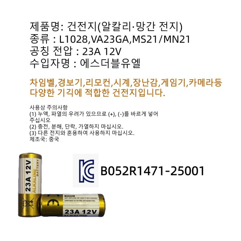 | 정격전압, 소비전력 | 23A12V | 에너지소비효율등급 | 상품 상세페이지 참조 |