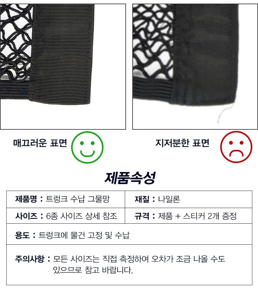 | 품명 및 모델명 | 삼에스 자동차 전차종 트렁크 네트 + 스티커 2p 세트 | 동일모델 출시년월 | 알수없음(업체미제공) |