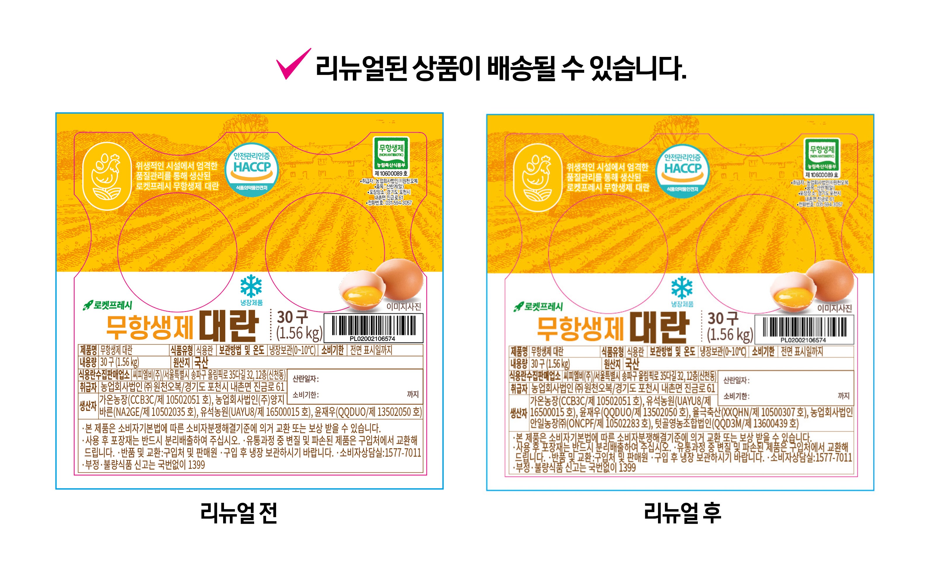 | 교환/반품 신청 기준일 | ㆍ단순변심에 의한 로켓배송 상품의 교환/반품은 제품 수령 후 30일 이내까지, 교환/반품 제한사항에 해당하지 않는 경우에만 가능 ※ 로켓프레시 상품의 경우 배송시작 후에는 취소가 불가하며, 배송완료 후 반품을 진행하실 수 있습니다. 단, 신선/냉장/냉동 상품의 단순변심의 경우 재판매가 불가한 상품의 특성 상 단순변심에 의한 반품이 제한됩니다. ㆍ상품의 내용이 표시·광고의 내용과 다른 경우에는 상품을 수령한 날부터 3개월 이내, 그 사실을 안 날 또는 알 수 있었던 날부터 |