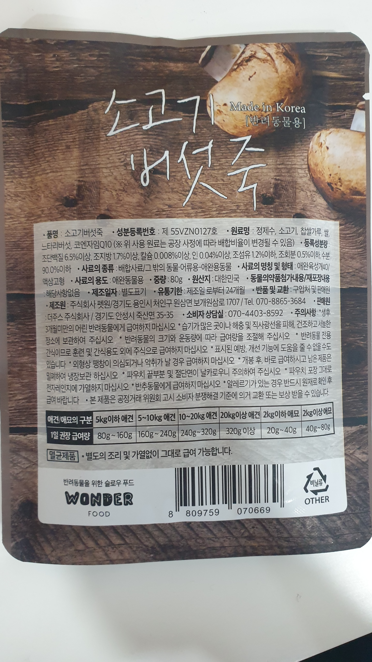 | 품명 및 모델명 | 소고기 버섯죽 | 인증/허가 사항 | 사료관리법에 따른 성분등록번호 : 컨텐츠 참조 |