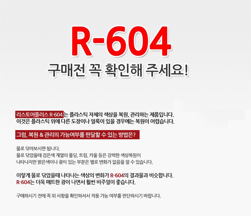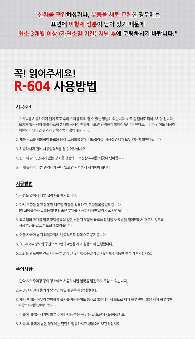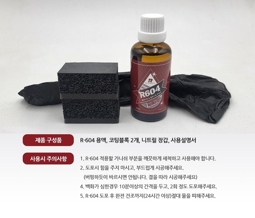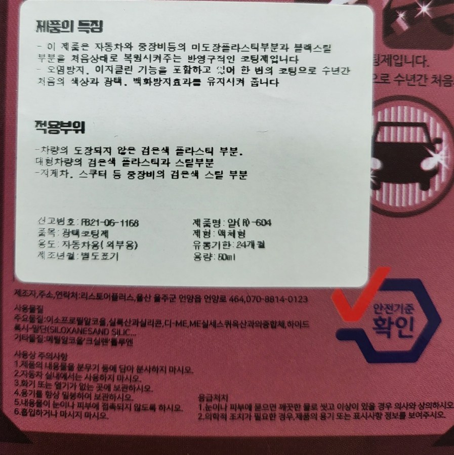 | 품목 및 제품명 | 광택코팅제,알(R)-604 | 용도(표백제의 경우 계열을 함께표시) 및 제형 | 자동차용(외부용),액체형 |