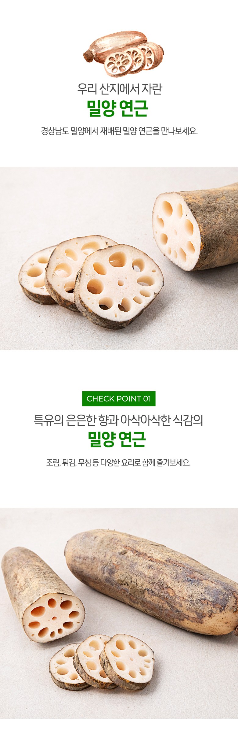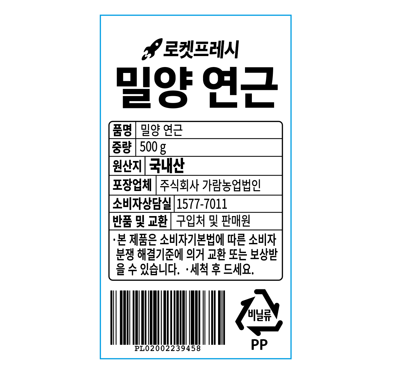 | 품목 또는 명칭 | 밀양 연근 | 포장단위별 내용물의 용량(중량),수량,크기 | 500g x 3개 |