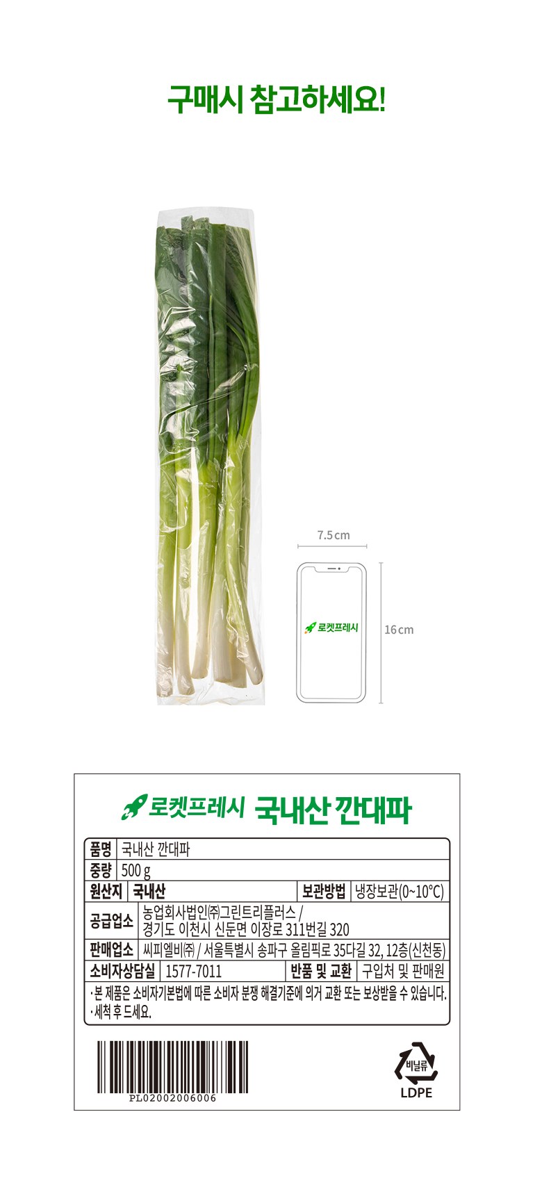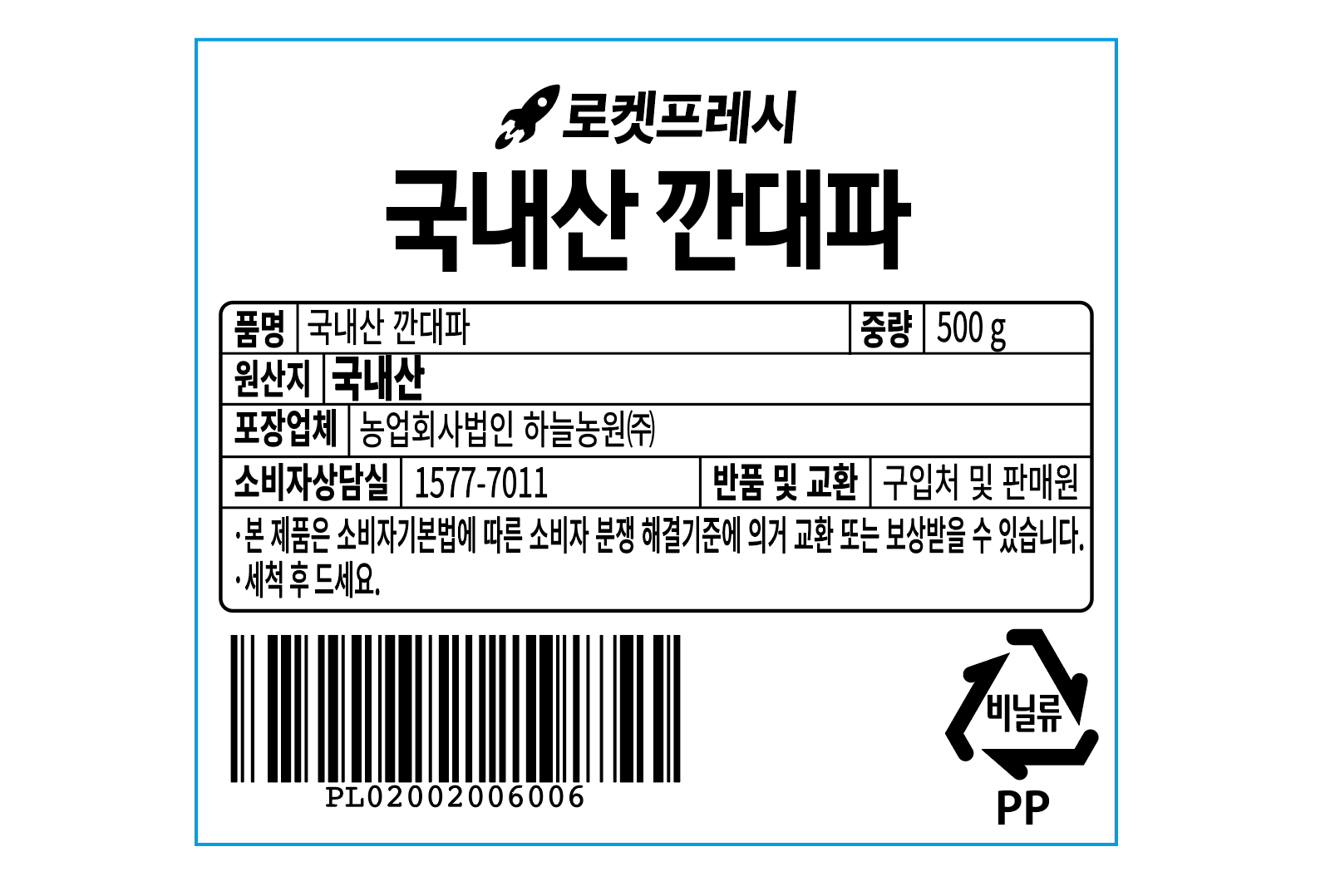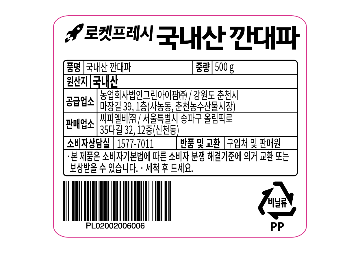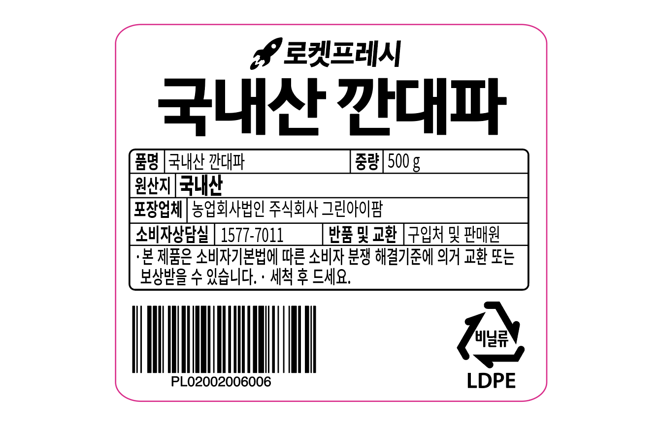 | 품목 또는 명칭 | 국내산 깐대파 | 포장단위별 내용물의 용량(중량),수량,크기 | 500gx1개 |