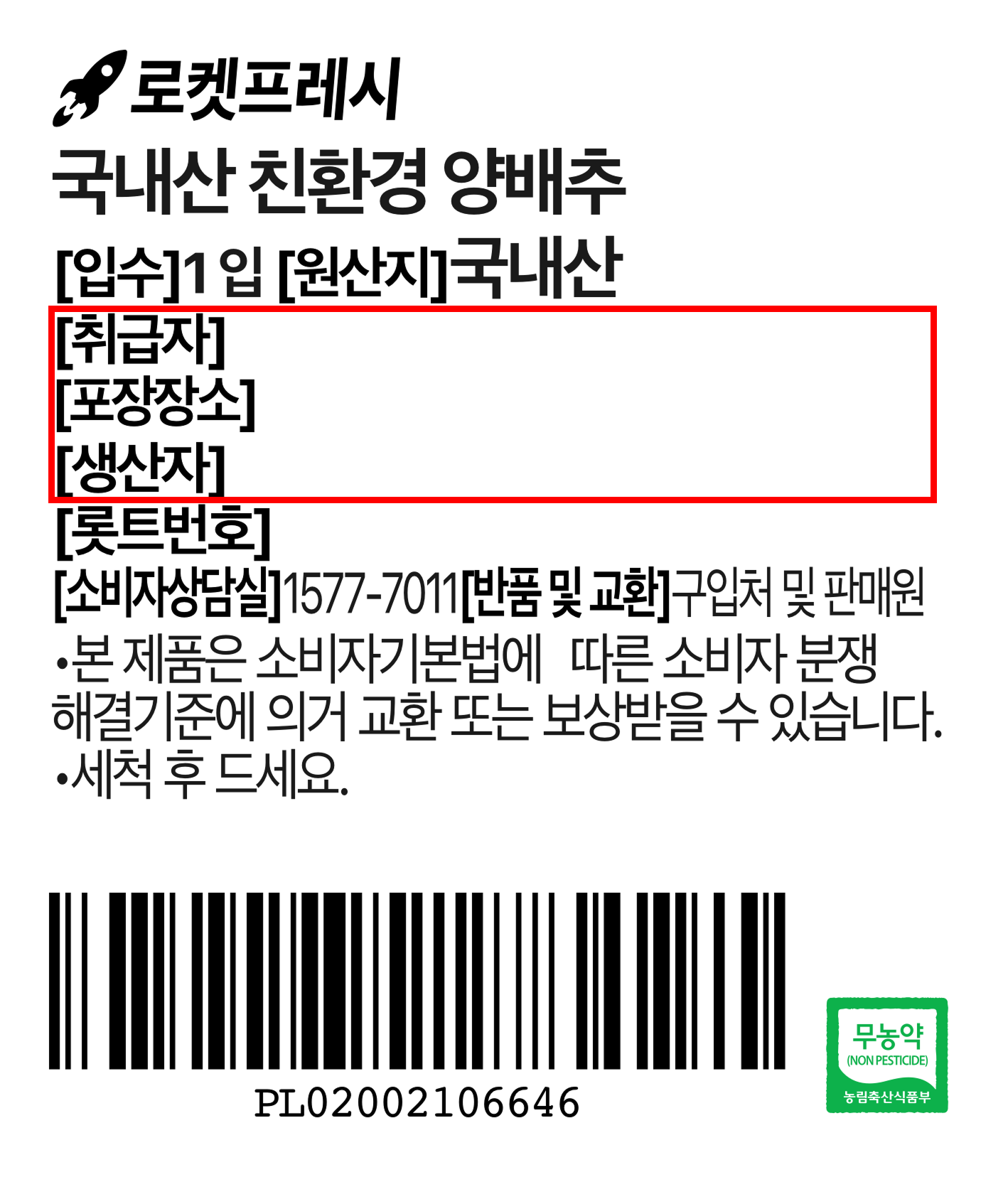 | 품목 또는 명칭 | 국내산 친환경 양배추 | 포장단위별 내용물의 용량(중량),수량,크기 | 1통(900g 이상)x3개 |